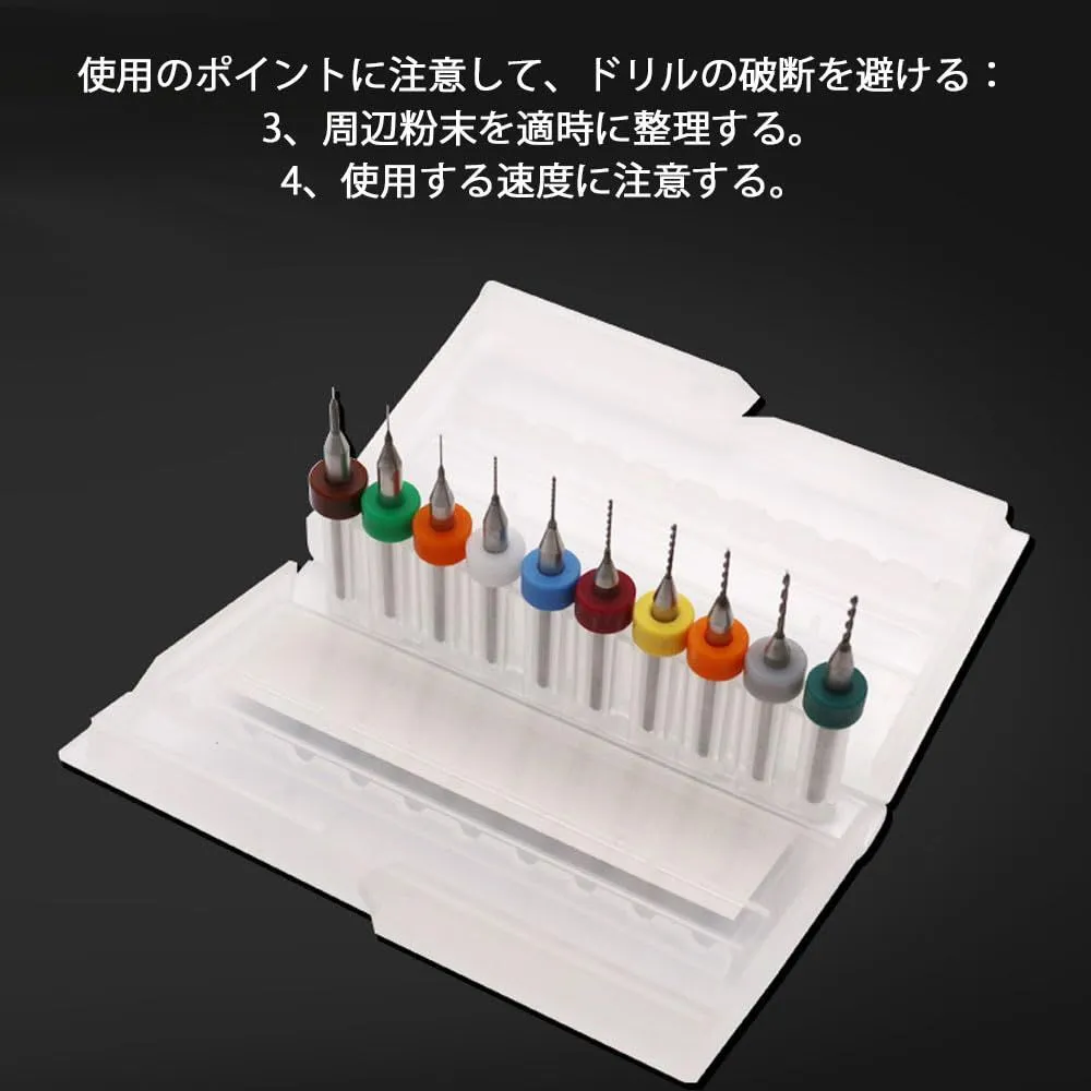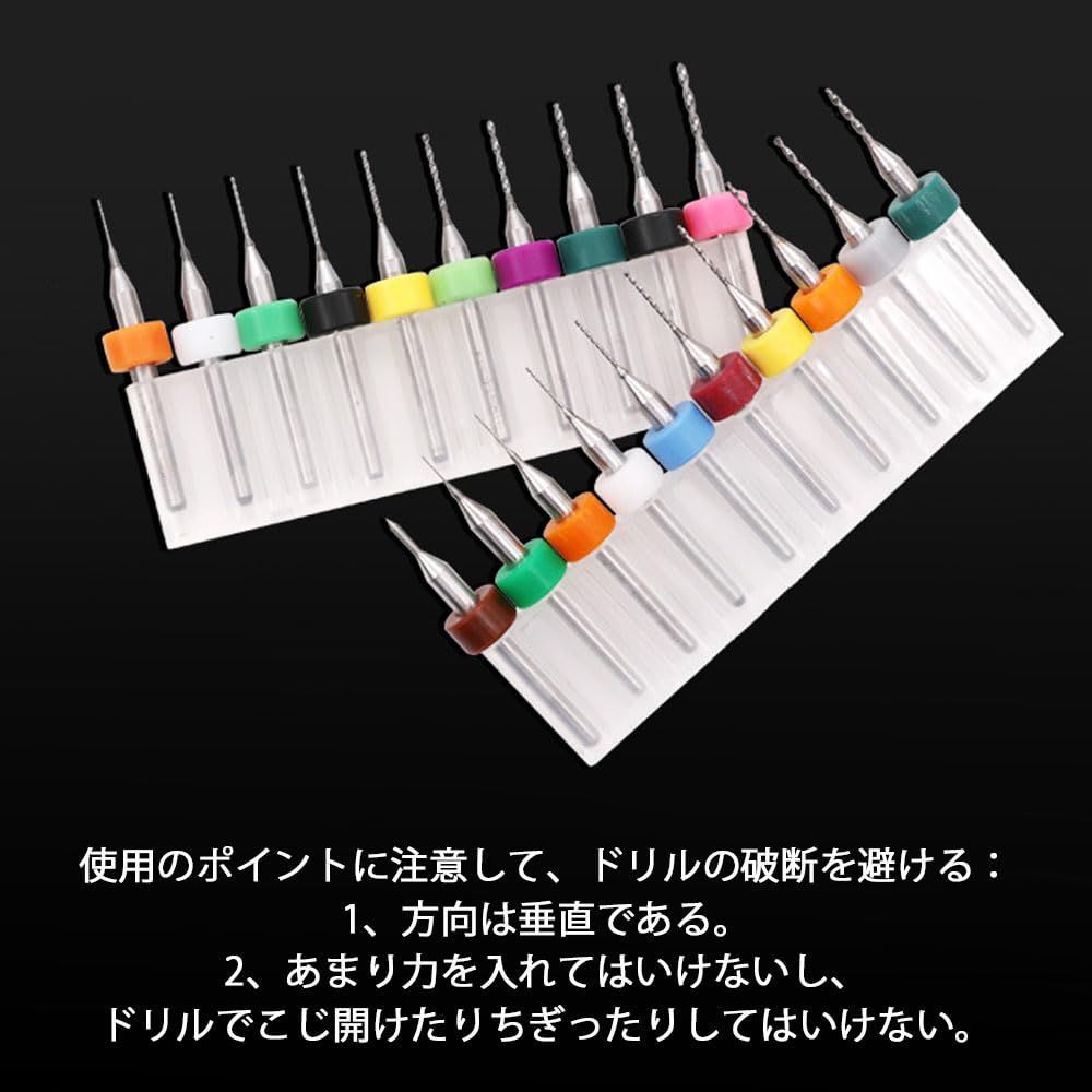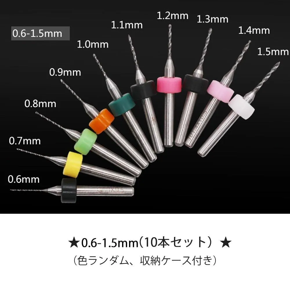 セット内容:極細ドリルビット10本セット(収納ボックス付き)、サイズ:0.6-1.5mm(0.6、0.7、0.8、0.9、1.0、1.1、1.2、1.3、1.4、1.5mm)、カラー:カラフル(色ランダム)。