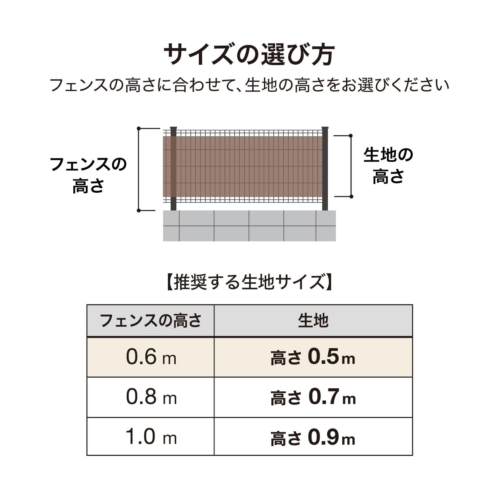 ボタンホール仕様で取付簡単。快適さを損なわない適度な通気性。必要に応じたサイズにカットできる。生地の上下に、等間隔のホールがあります。 シェード生地だから適度な通気性があり、快適さを損なわず、風田によるフェンスへの負荷を軽減します。 生地をカットする際、縦向きにカットしてください。 カットした生地の端は補強のため、 2回折り込み、付属の結束バンドを用いて取り付けてください。境界フェンスはもちろんバルコニーフェンスにも隣家との境界の間仕切りに付属の結束バンドでホールに等間隔で固定。 目安として、約30cm間隔で取り付けてください。