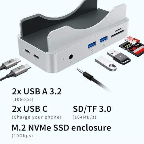 6-in-1接続性:2つの10Gbps USB-Aポート、SD/TFカードスロット、ヘッドフォンやマイク用の3.5mmオーディオジャックが備わっています。適切な数のポートで、ごちゃごちゃしません。