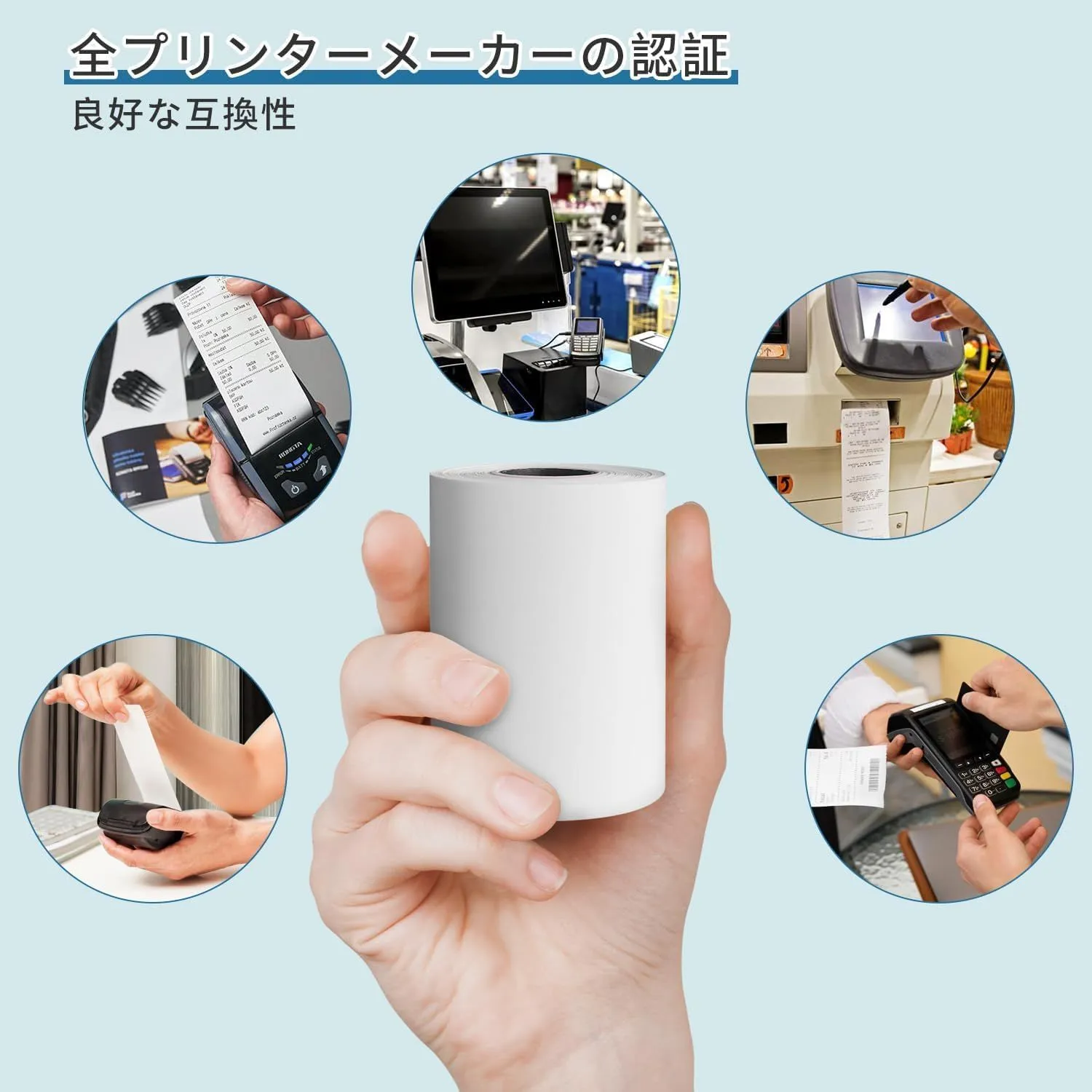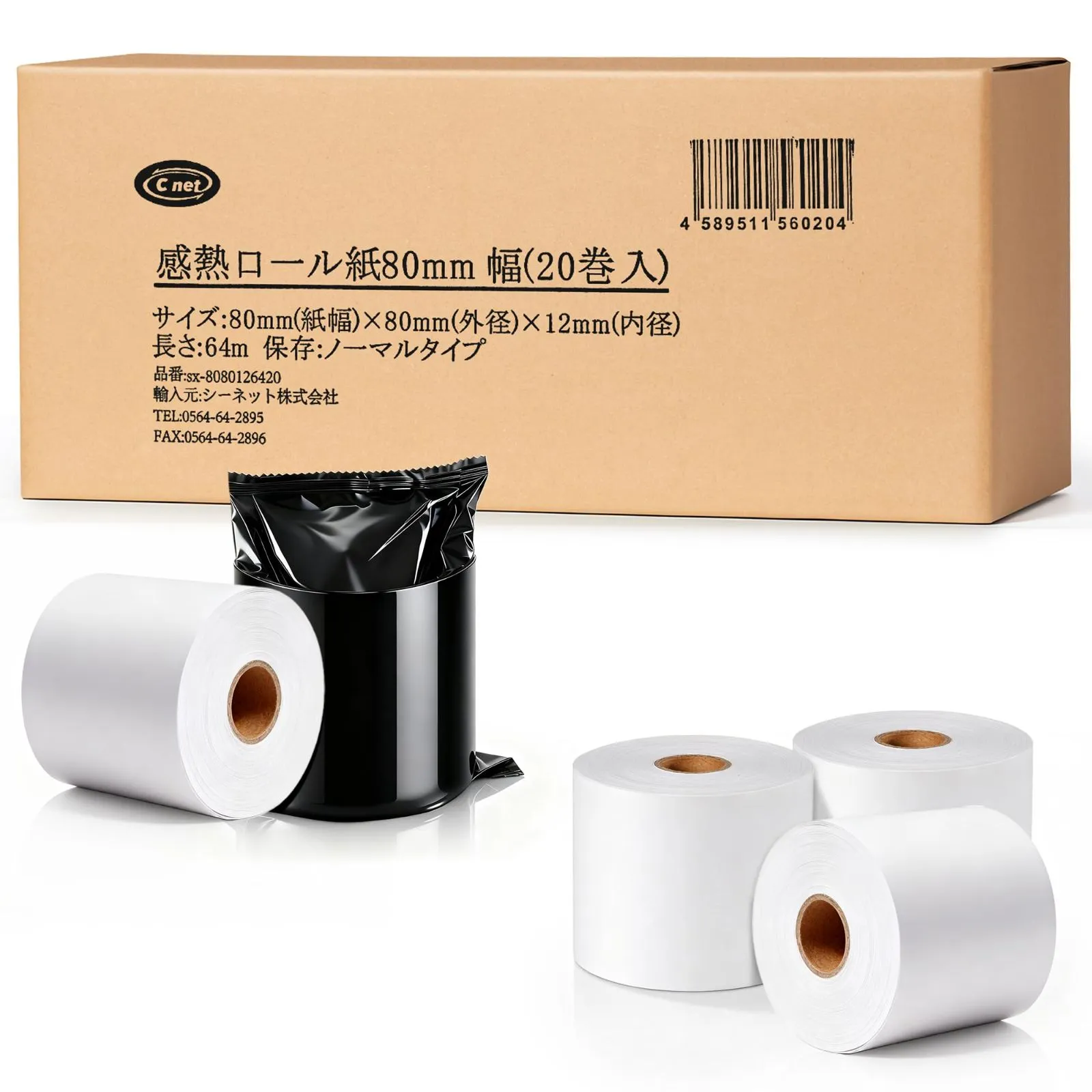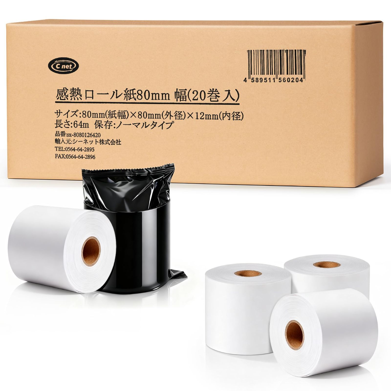 【商品仕様】感熱ロール紙サイズ:幅80mm×外径80mm×内径12mm 20巻入、長さ64m。紙の厚さ:75μです。