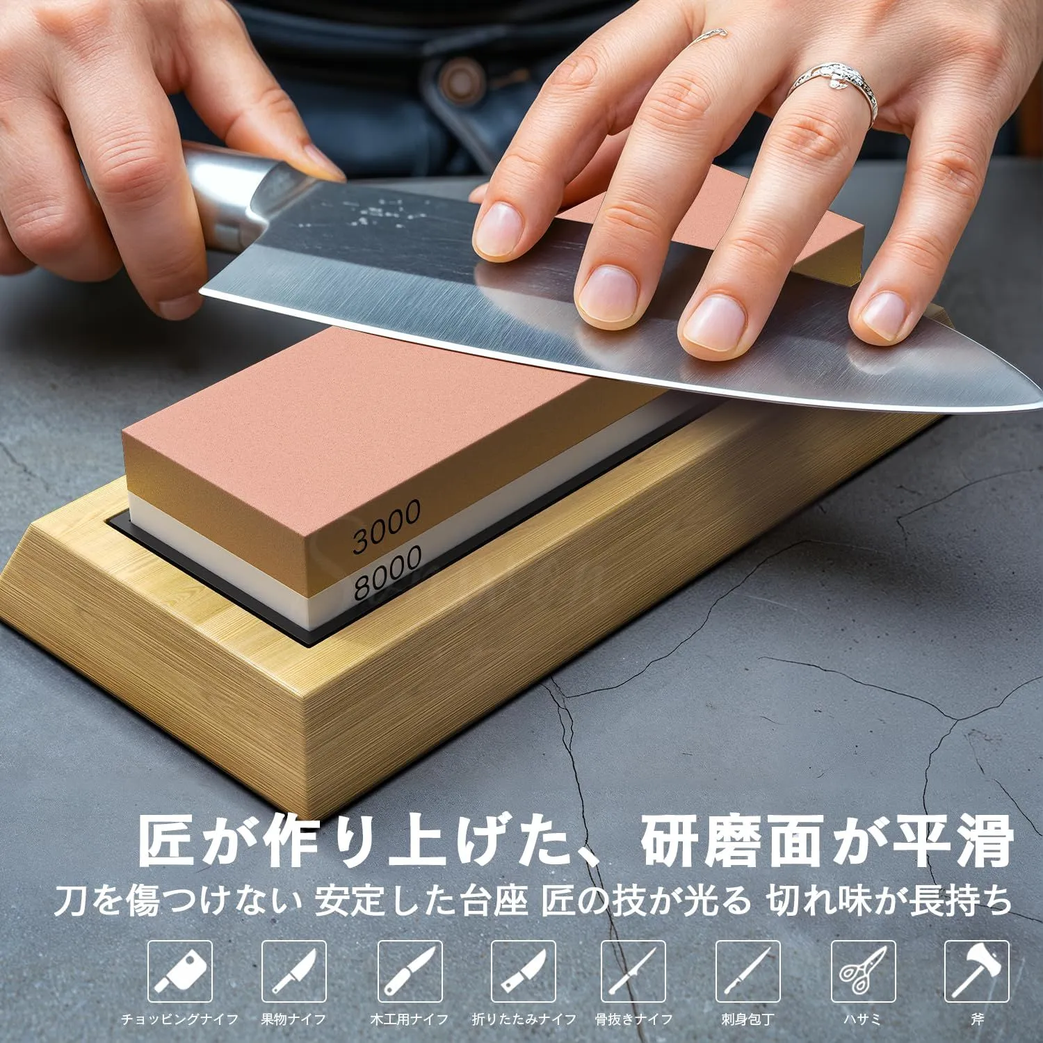 【様々な包丁に対応でき】:通常の洋包丁、刺身包丁、三徳包丁、出刃包丁、柳刃包丁、牛刀、中華包丁、ハサミなどはもちろん、鋼やステンレス製包丁も鋭く研げます