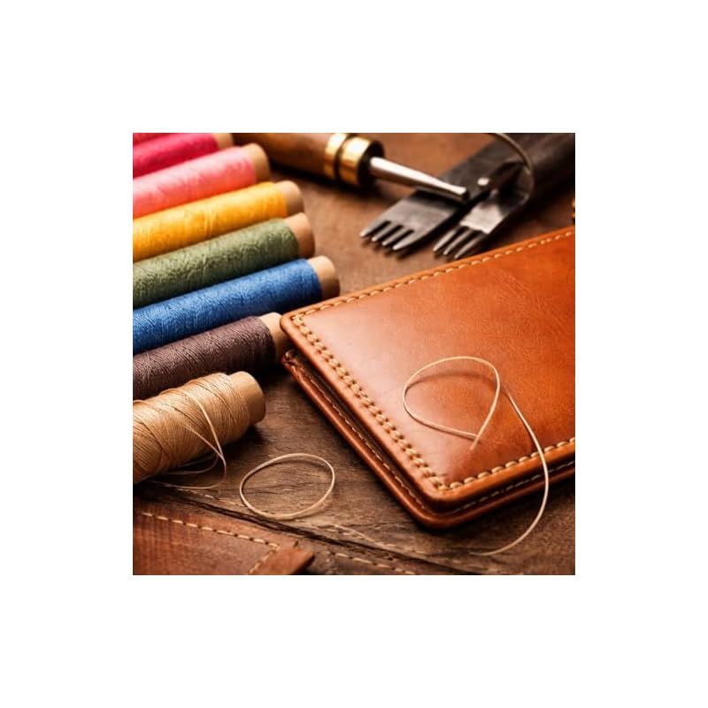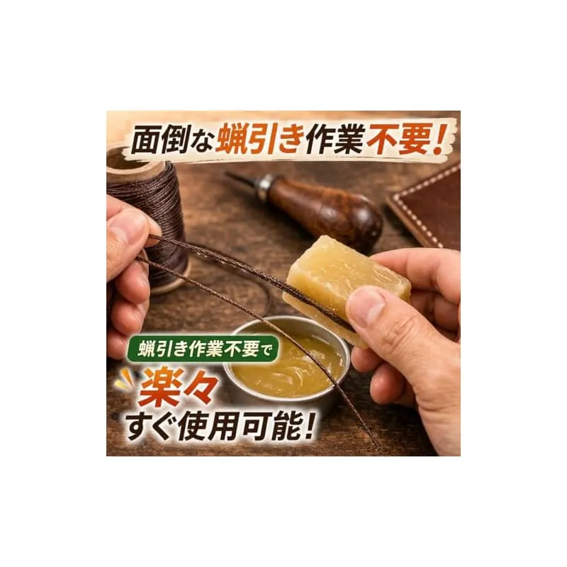 【滑りがよく、作業がスムーズに】 蝋引き加工されたレザークラフト糸は滑りが良く、手縫い作業がスムーズに。また、ワックス加工により摩耗に強く、革・レザー素材の縫製に適したレザークラフト用糸です。 3