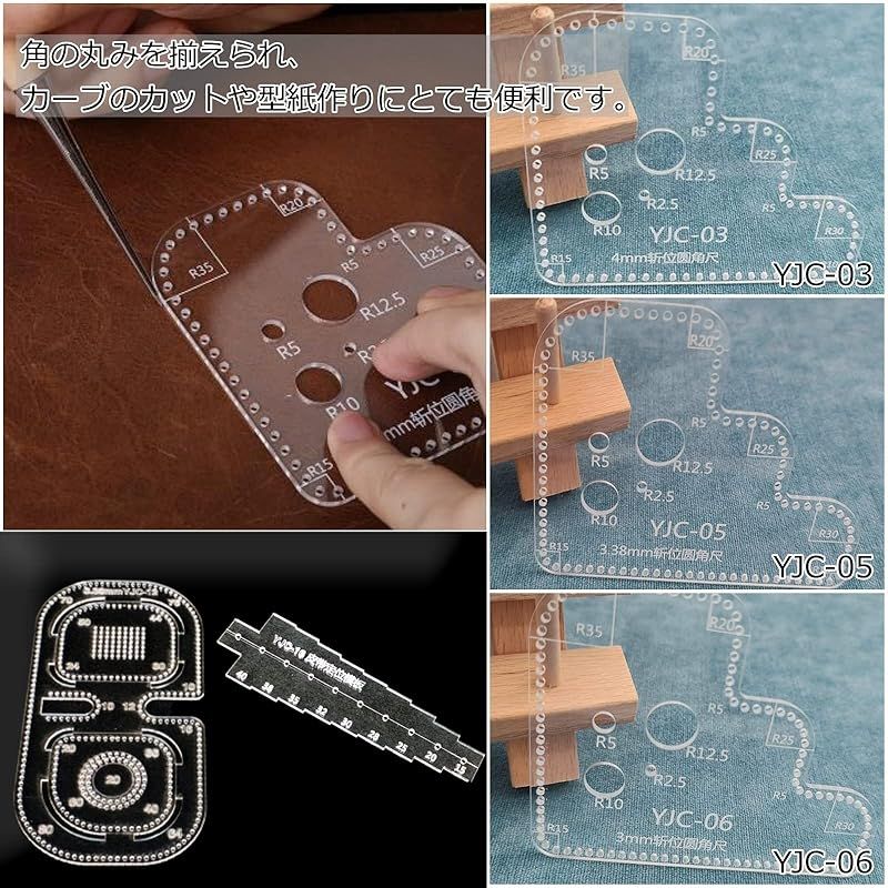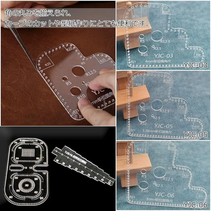 【透明アクリル製】保護用のクラフト紙を剥がしてからお使いください。定規本体は透明ですので、下地を確認しながら作業が可能です。 YJC-03(穴の間隔:3mm)、 YJC-05(穴の間隔:3.85mm)、 YJC-06(穴の間隔:4mm)、 YJC-12(穴の間隔:3.38mm)、 YJC-16 説明書は付属しておりません。予めご了承ください。