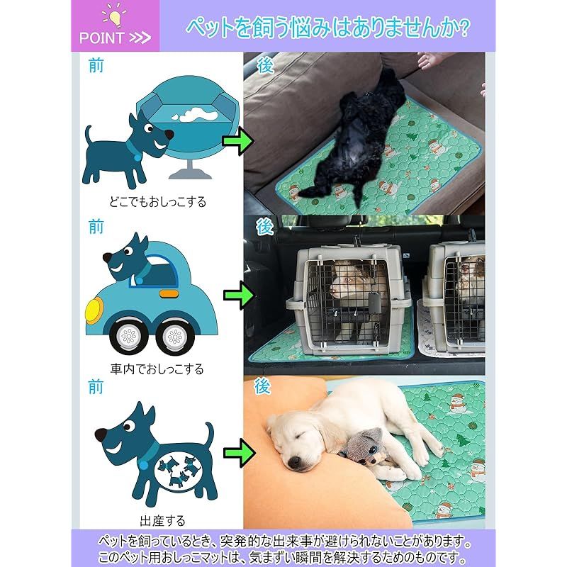 【幅広い適用性】このペット用おしっこマットは中型・大型犬、猫、うさぎ、モルモットなどの動物に適用しています。特に妊娠中や授乳中のペット、または失禁、糖尿病などの病気になる、介護必要があるペットに最適!床だけではなく、ソファ、ペットトイレ、ペットベッド、ケンネル、ペットキャリーバッグ、ペットサークルやペットケージにも使え、そして、お出かけや旅行する時に車内で敷けば安心にご利用いただけます。このペット用おしっこマットはペットトイレまたはペットベッドの下に使用することは一番お勧めします。 ??