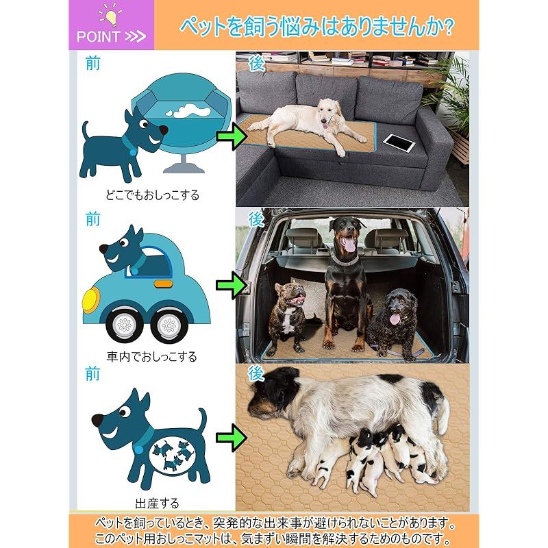 【幅広い適用性】このペット用おしっこマットは小型・中型犬、猫、うさぎ、ハムスター、モルモットなどの動物に適用しています。特に妊娠中や授乳中のペット、または失禁、糖尿病などの病気になる、介護必要があるペットに最適!床だけではなく、ソファ、ペットトイレ、ペットベッド、ケンネル、ペットキャリーバッグ、ペットサークルやペットケージにも使え、そして、お出かけや旅行する時に車内で敷けば安心にご利用いただけます。このペット用おしっこマットはペットトイレまたはペットベッドの下に使用することは一番お勧めします。 ??