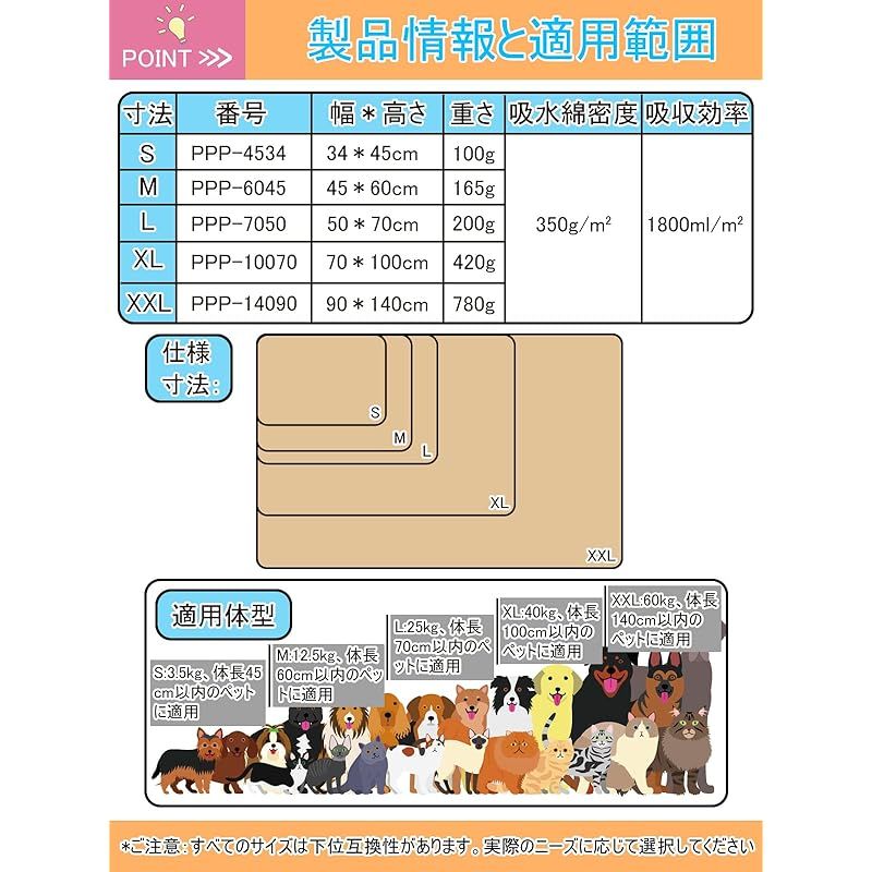 【商品説明】 このペット用おしっこマットは吸水・速乾性がある高品質素材を厳選により、四重構造に設計されています。通気性のあるメッシュ面は急速に疎水でき、高品質の吸水綿とTPU防水綿は1800ml/の超吸収率を持って、素早いおしっこなどの水分を閉じ込めことができ浸透しにくい。そして、滑り止め底は、やんちゃな犬が暴れてマットの位置を移動するのを防げます。吸水・速乾性・漏れ防止を実現するとともに、細菌の成長を防げ、快適性を実現しています。