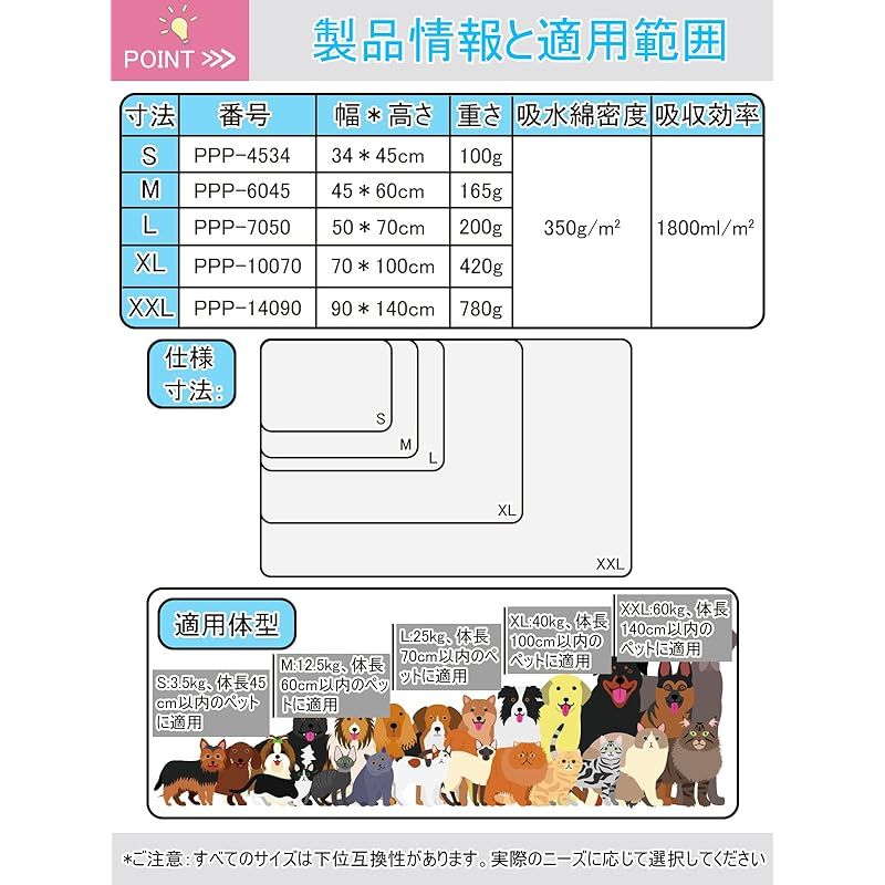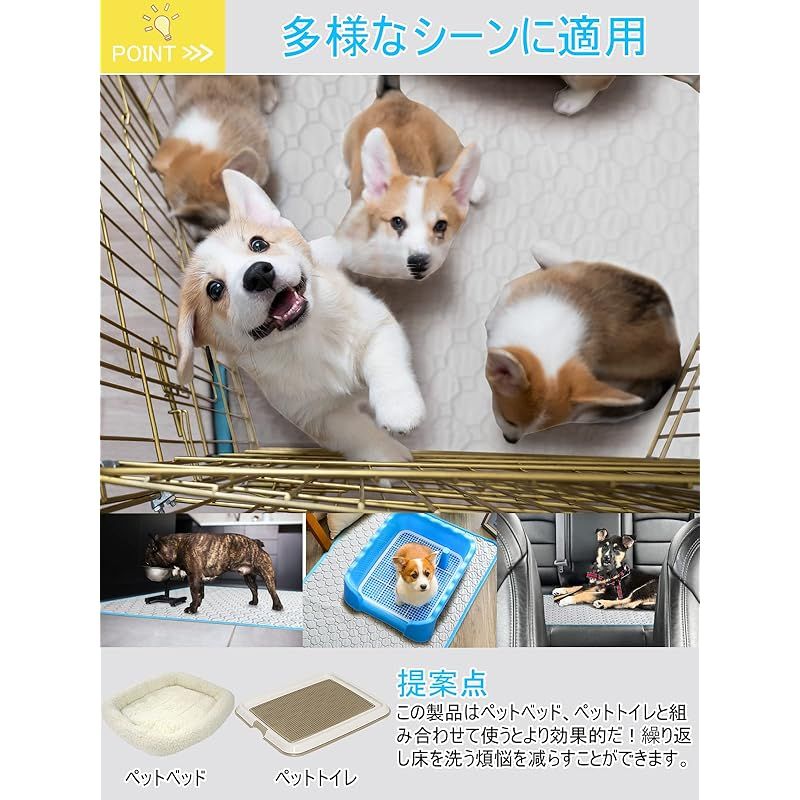 【幅広い適用性】このペット用おしっこマットは中型・大型犬、猫、うさぎ、モルモットなどの動物に適用しています。床だけではなく、ソファ、ペットトイレ、ペットベッド、ケンネル、ペットキャリーバッグ、ペットサークルやペットケージにも使え、そして、お出かけや旅行する時に車内で敷けば安心にご利用いただけます。このペット用おしっこマットはペットトイレまたはペットベッドの下に使用することは一番お勧めします。 ??