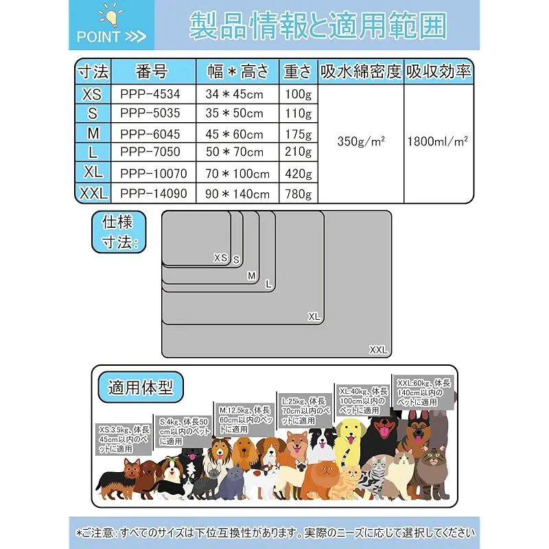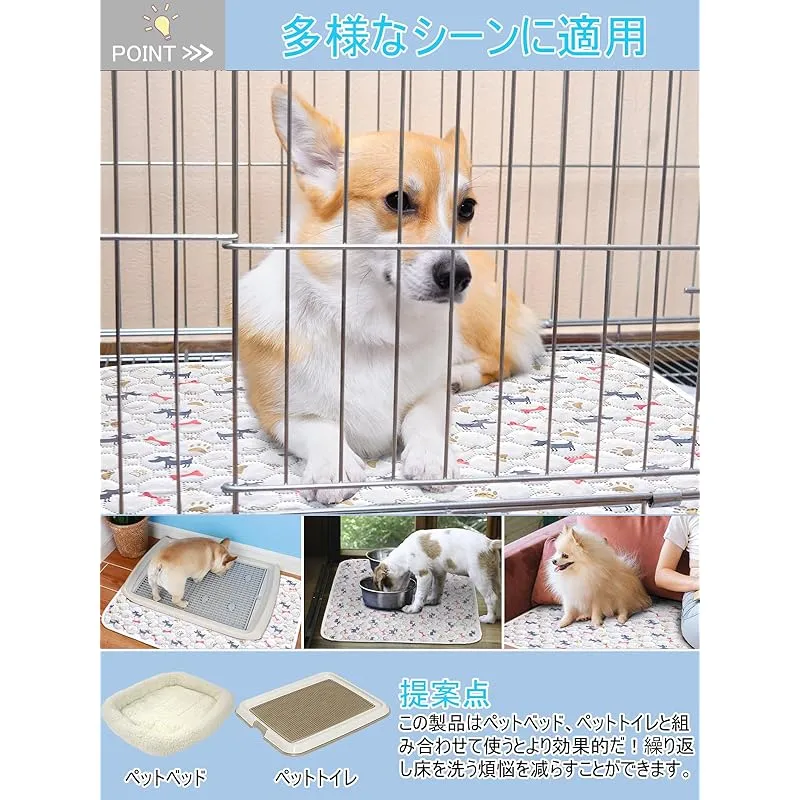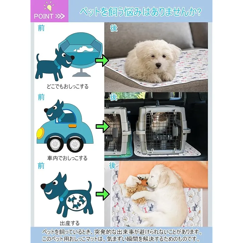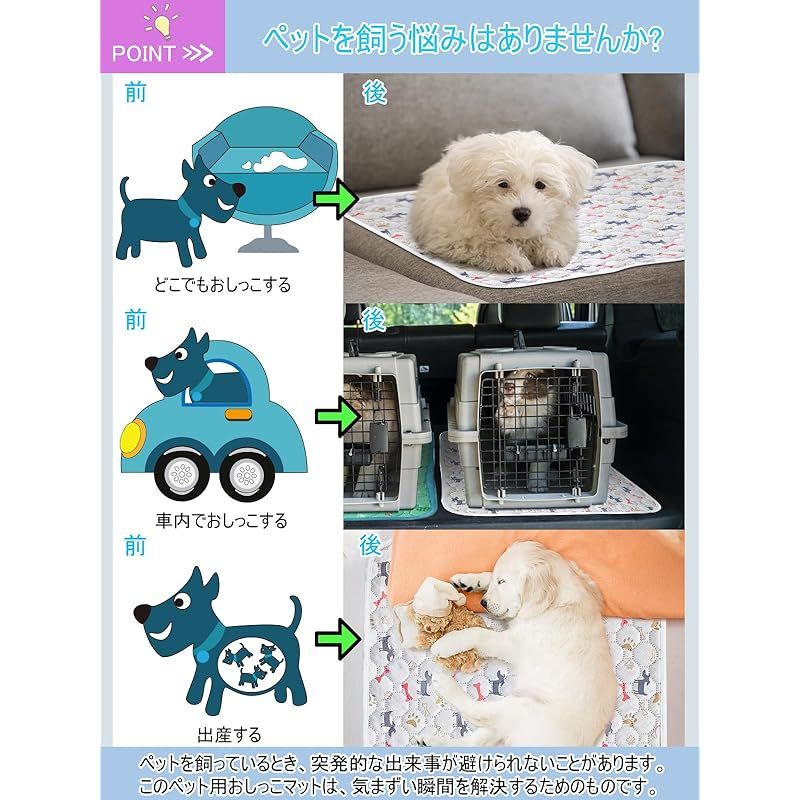 【幅広い適用性】このペット用おしっこマットは中型・大型犬、猫、うさぎ、モルモットなどの動物に適用しています。特に妊娠中や授乳中のペット、または失禁、糖尿病などの病気になる、介護必要があるペットに最適!床だけではなく、ソファ、ペットトイレ、ペットベッド、ケンネル、ペットキャリーバッグ、ペットサークルやペットケージにも使え、そして、お出かけや旅行する時に車内で敷けば安心にご利用いただけます。このペット用おしっこマットはペットトイレまたはペットベッドの下に使用することは一番お勧めします。 ??
