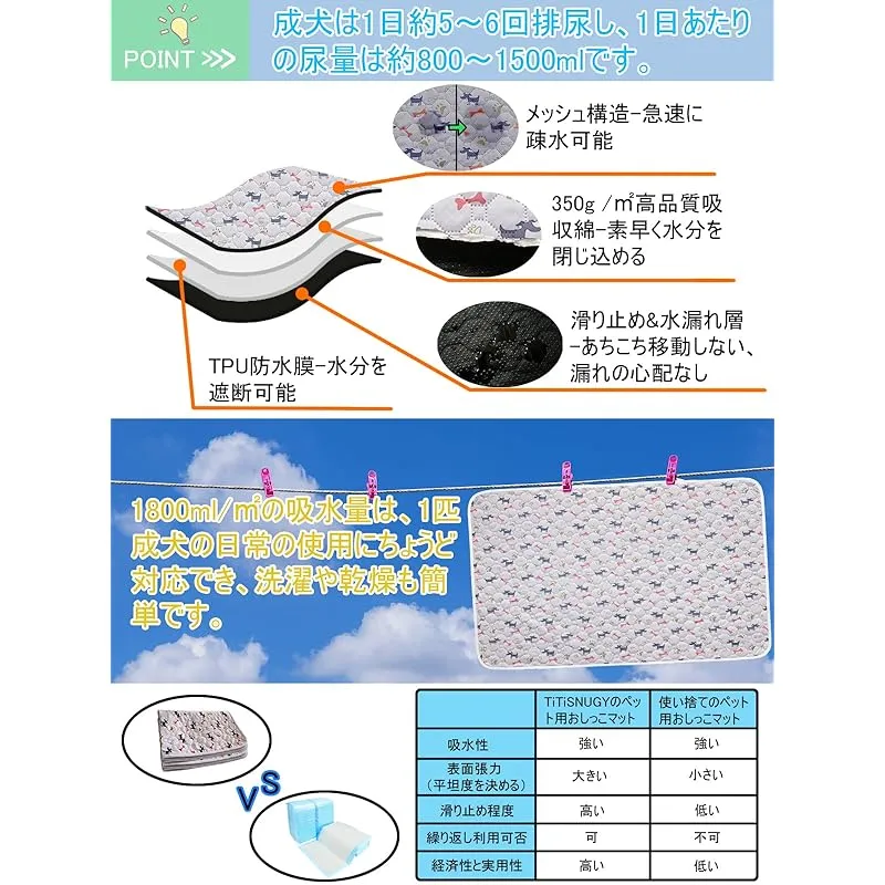 【超吸収&漏れ防止】このペット用おしっこマットは吸水・速乾性がある高品質素材を厳選により、四重構造に設計されています。通気性のあるメッシュ面は急速に疎水でき、高品質の吸水綿とTPU防水綿は1800ml/の超吸収率を持って、素早くおしっこなどの水分を閉じ込めことができ浸透しにくい。吸水・速乾性・漏れ防止を実現するとともに、細菌の成長を防げ、快適性を実現しています。そして、滑り止め底は、やんちゃな犬が暴れてマットの位置を移動するのを防げます。 ??