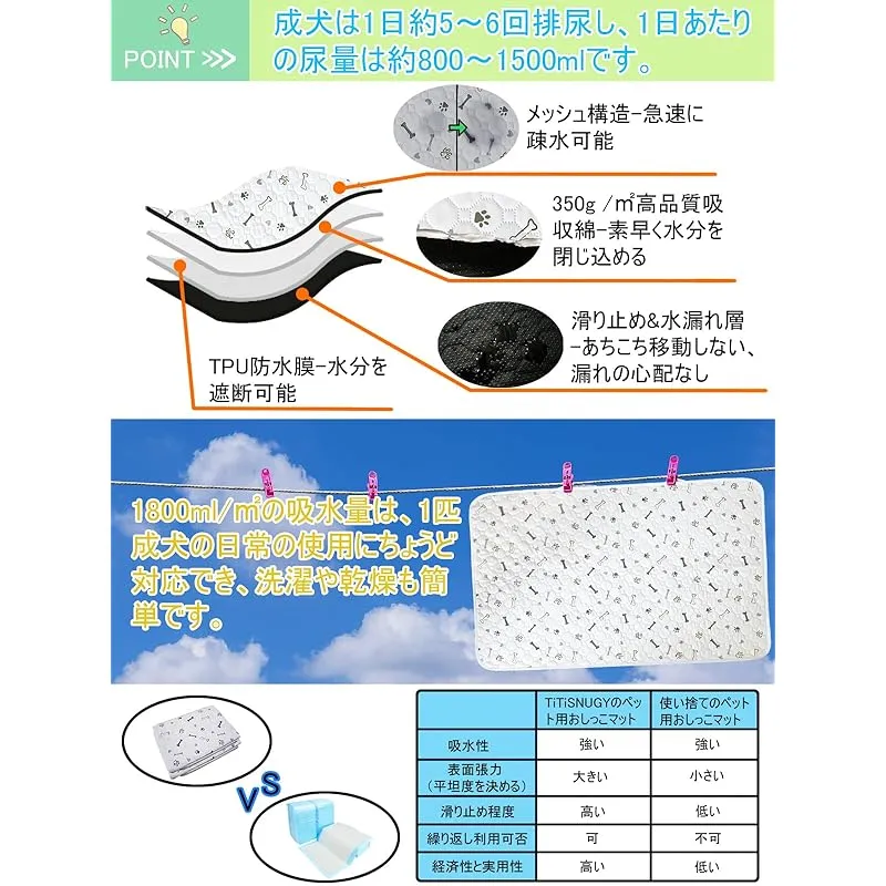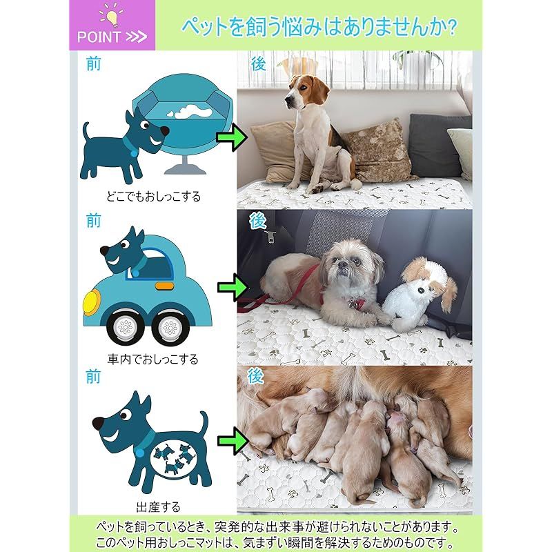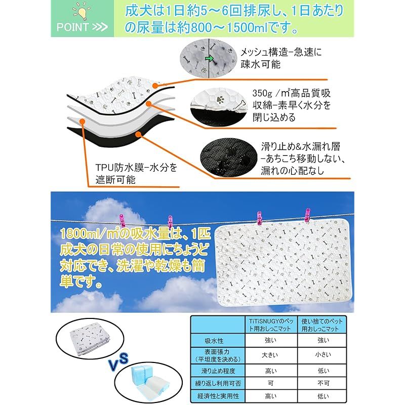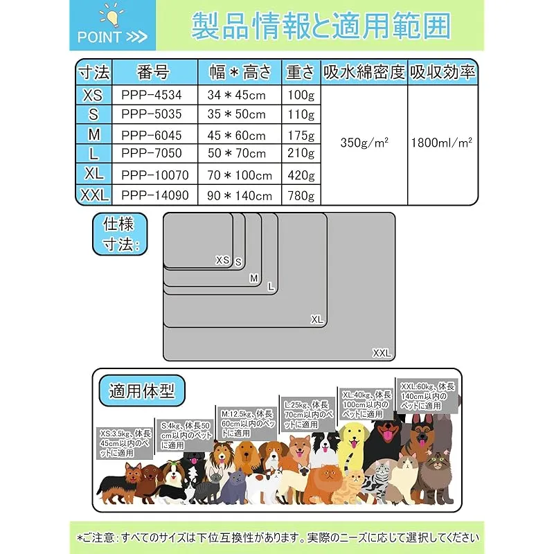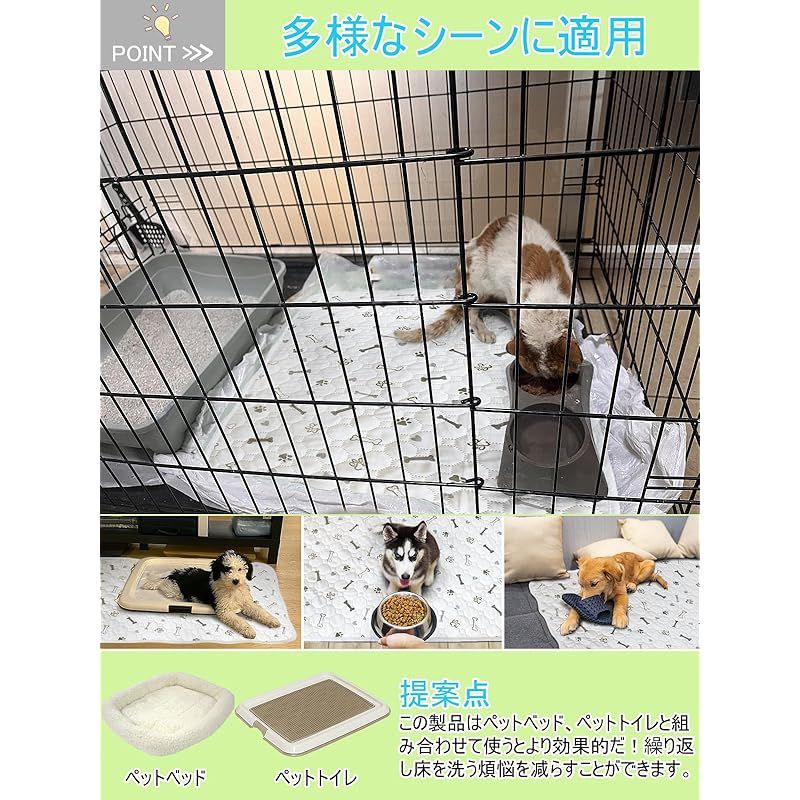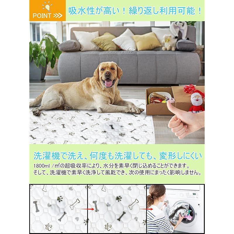 【商品説明】 このペット用おしっこマットは吸水・速乾性がある高品質素材を厳選により、四重構造に設計されています。通気性のあるメッシュ面は急速に疎水でき、高品質の吸水綿とTPU防水綿は1800ml/の超吸収率を持って、素早いおしっこなどの水分を閉じ込めことができ浸透しにくい。そして、滑り止め底は、やんちゃな犬が暴れてマットの位置を移動するのを防げます。吸水・速乾性・漏れ防止を実現するとともに、細菌の成長を防げ、快適性を実現しています。