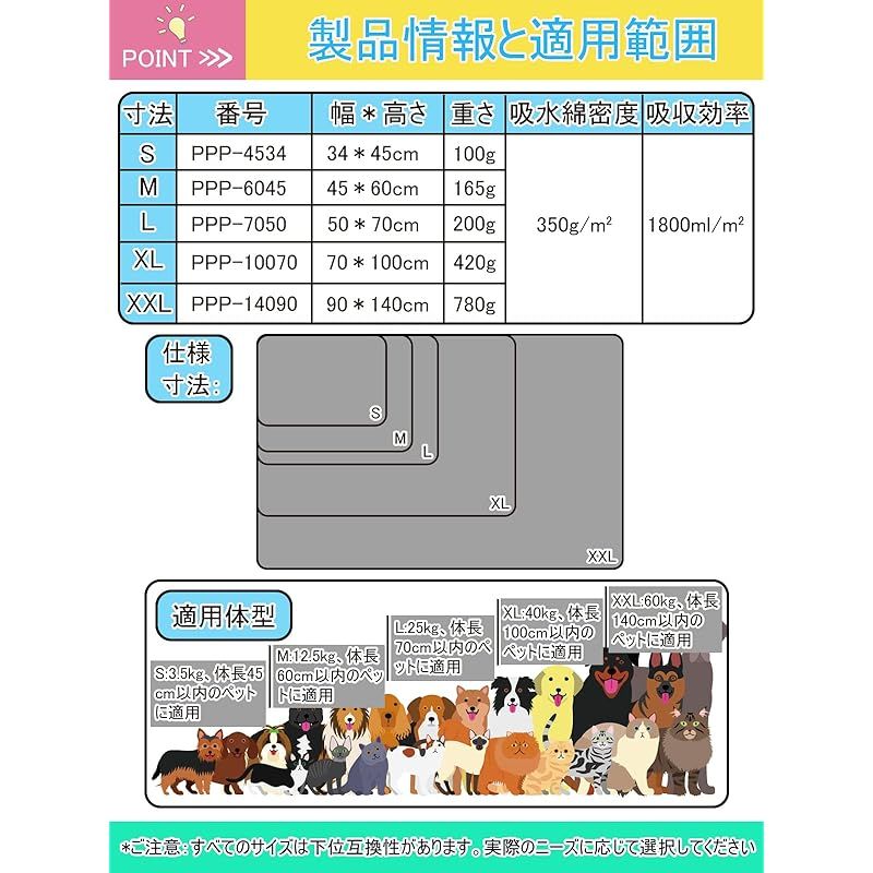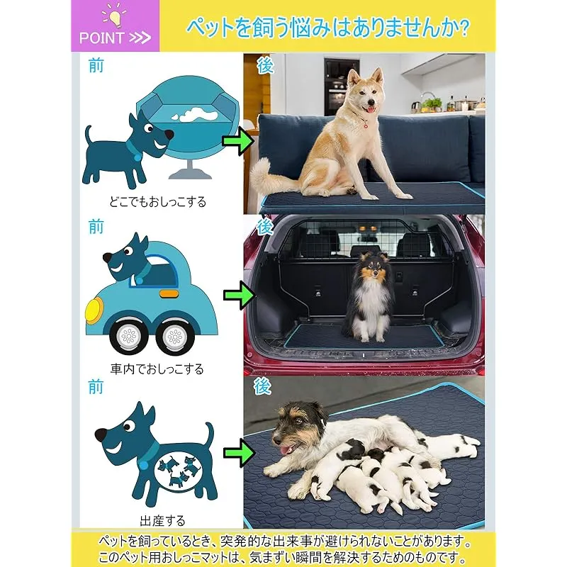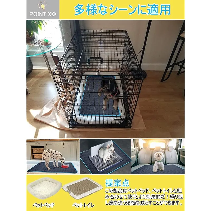 【幅広い適用性】このペット用おしっこマットは中型・大型犬、猫、うさぎ、モルモットなどの動物に適用しています。特に妊娠中や授乳中のペット、または失禁、糖尿病などの病気になる、介護必要があるペットに最適!床だけではなく、ソファ、ペットトイレ、ペットベッド、ケンネル、ペットキャリーバッグ、ペットサークルやペットケージにも使え、そして、お出かけや旅行する時に車内で敷けば安心にご利用いただけます。このペット用おしっこマットはペットトイレまたはペットベッドの下に使用することは一番お勧めします。 ??