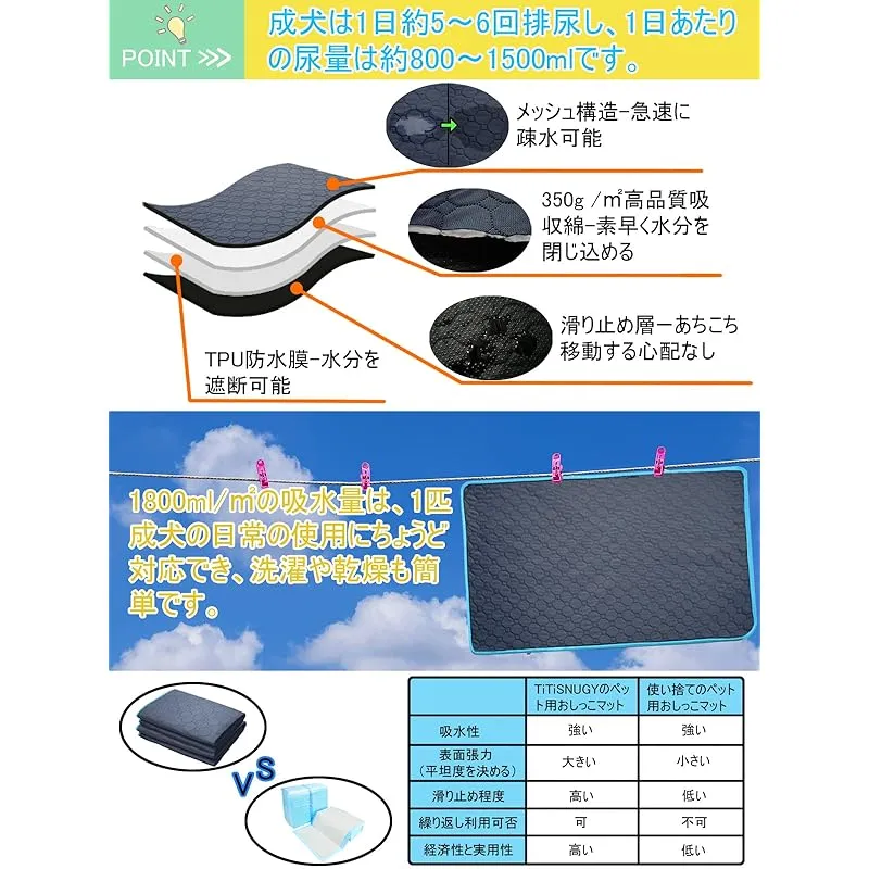 【繰り返し利用可能】一回使い捨てのおしっこシートよりもっと経済的で環境にやさしく。このペット用おしっこマットは柔らかく耐用性がよく、お手入れも簡単で、洗濯機に入れて洗えます。何度も洗濯しても、壊しにくい。速乾性がよく、繰り返し使用できます。折り畳み可能なので収納も便利です。(柔軟剤、および漂白剤の使用はお控えください) ??