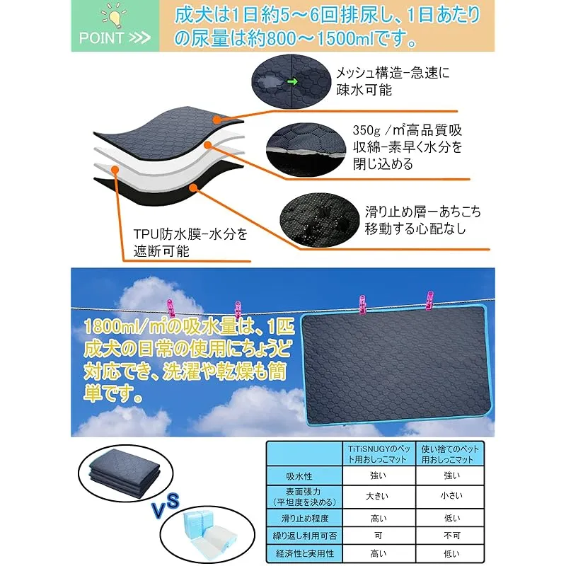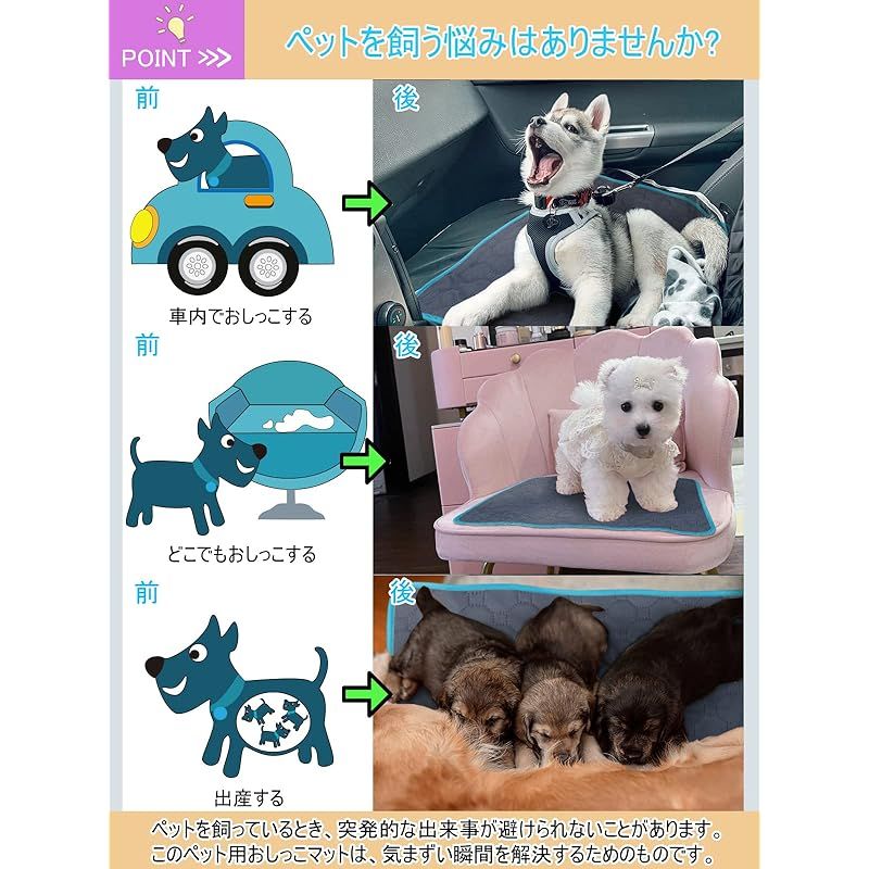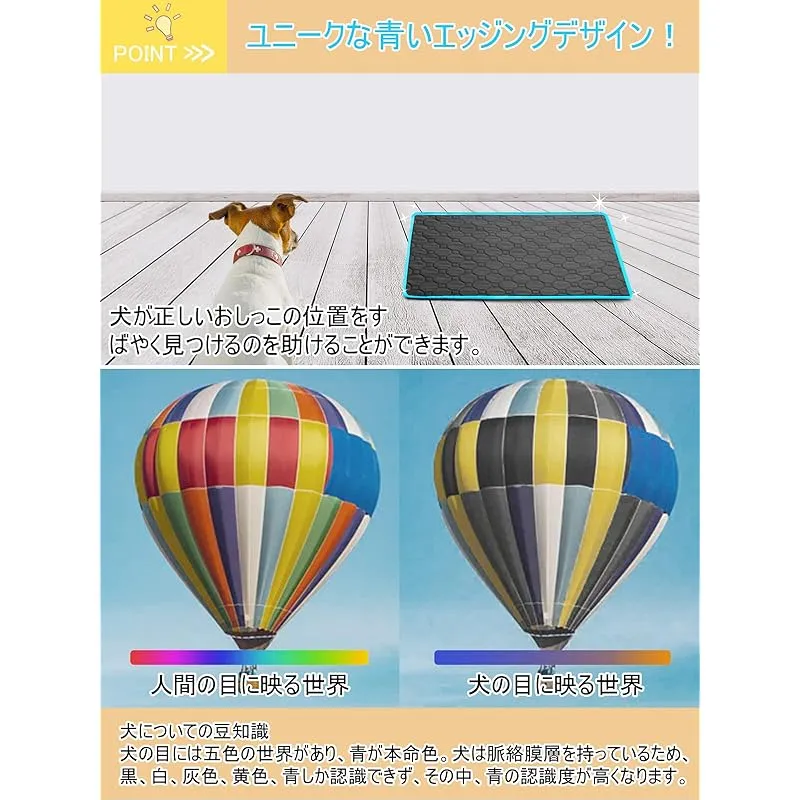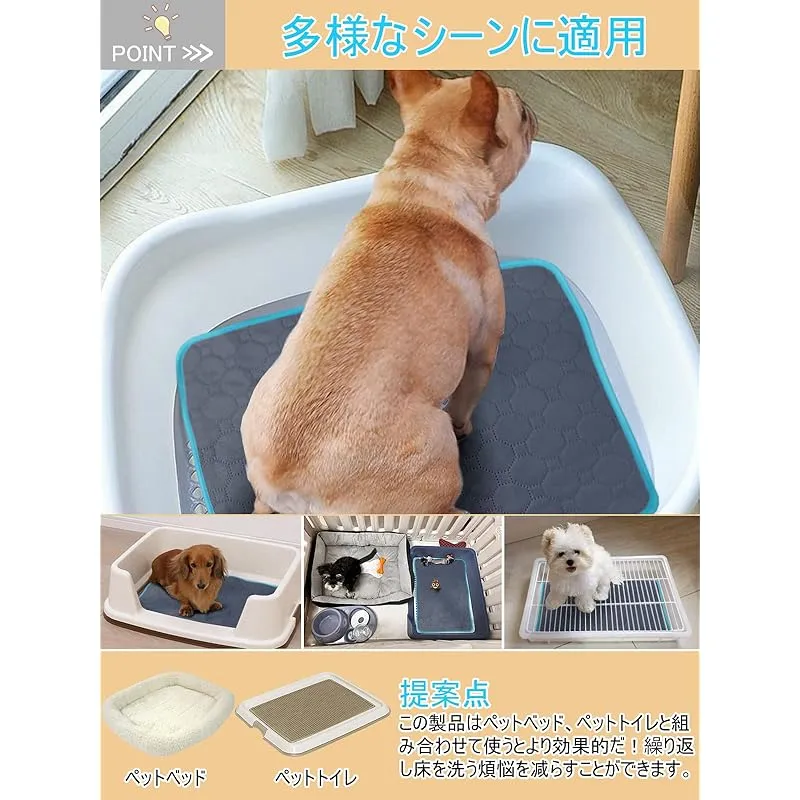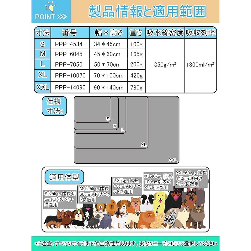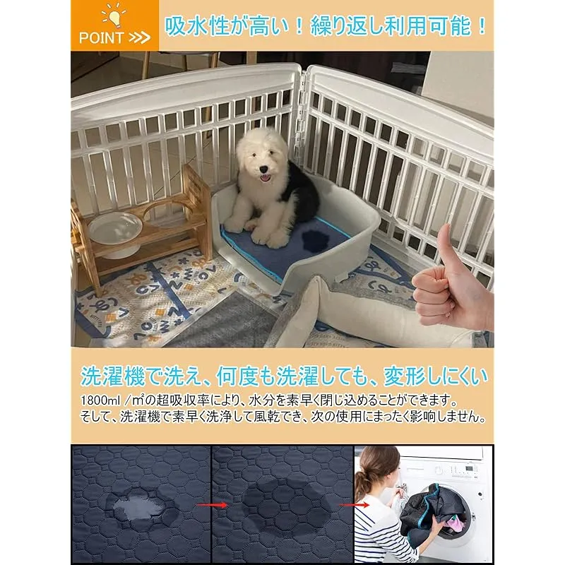 【商品説明】 このペット用おしっこマットは吸水・速乾性がある高品質素材を厳選により、四重構造に設計されています。通気性のあるメッシュ面は急速に疎水でき、高品質の吸水綿とTPU防水綿は1800ml/の超吸収率を持って、素早いおしっこなどの水分を閉じ込めことができ浸透しにくい。そして、滑り止め底は、やんちゃな犬が暴れてマットの位置を移動するのを防げます。吸水・速乾性・漏れ防止を実現するとともに、細菌の成長を防げ、快適性を実現しています。