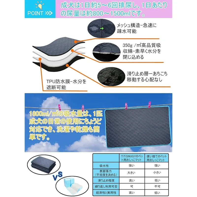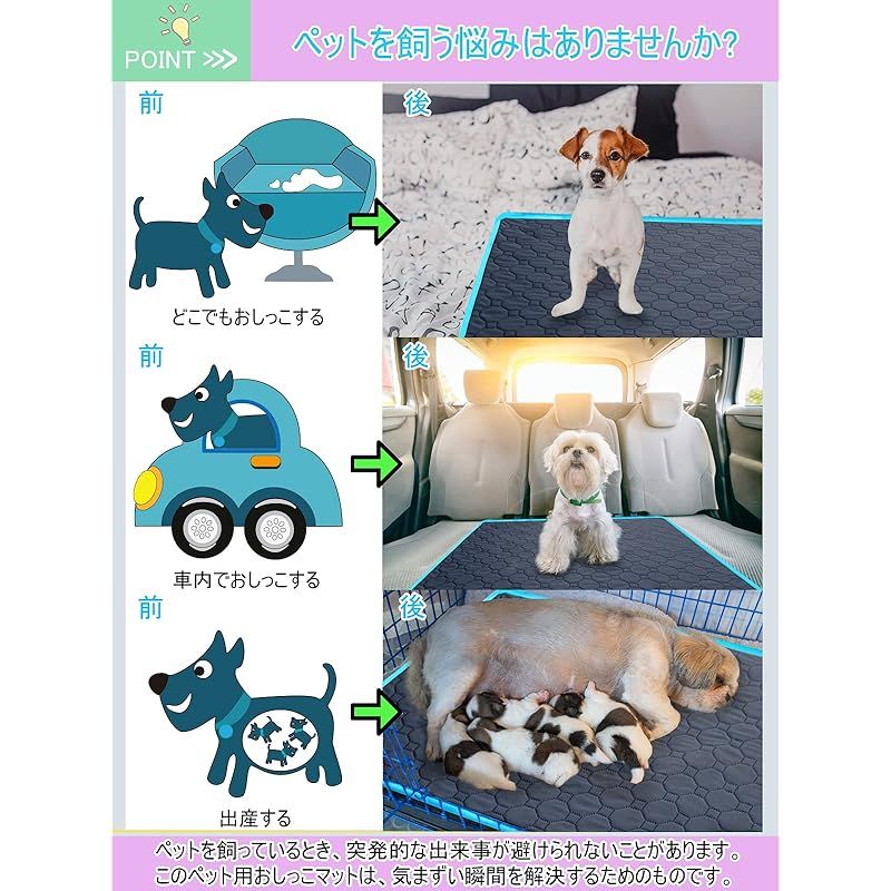 【繰り返し利用可能】一回使い捨てのおしっこシートよりもっと経済的で環境にやさしく。このペット用おしっこマットは柔らかく耐用性がよく、お手入れも簡単で、洗濯機に入れて洗えます。何度も洗濯しても、壊しにくい。速乾性がよく、繰り返し使用できます。折り畳み可能なので収納も便利です。(柔軟剤、および漂白剤の使用はお控えください) ??