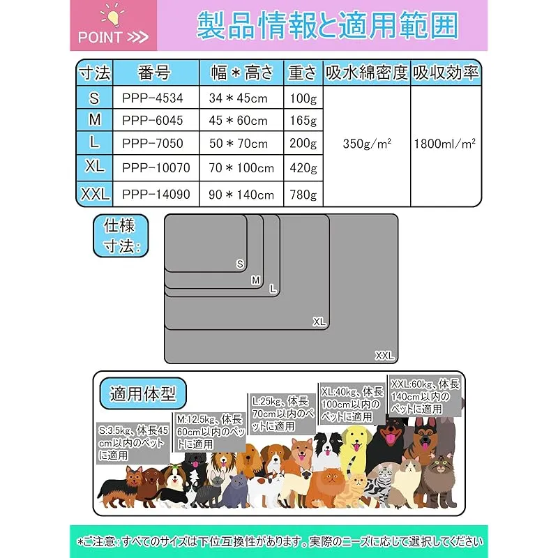【幅広い適用性】このペット用おしっこマットは小型・中型犬、猫、うさぎ、ハムスター、モルモットなどの動物に適用しています。特に妊娠中や授乳中のペット、または失禁、糖尿病などの病気になる、介護必要があるペットに最適!床だけではなく、ソファ、ペットトイレ、ペットベッド、ケンネル、ペットキャリーバッグ、ペットサークルやペットケージにも使え、そして、お出かけや旅行する時に車内で敷けば安心にご利用いただけます。このペット用おしっこマットはペットトイレまたはペットベッドの下に使用することは一番お勧めします。 ??