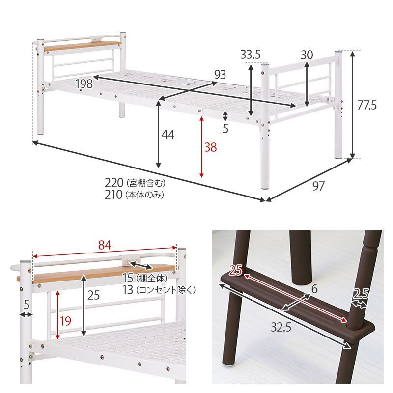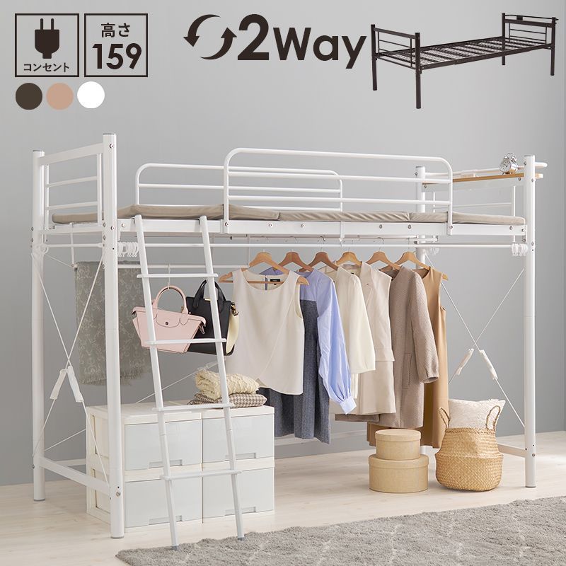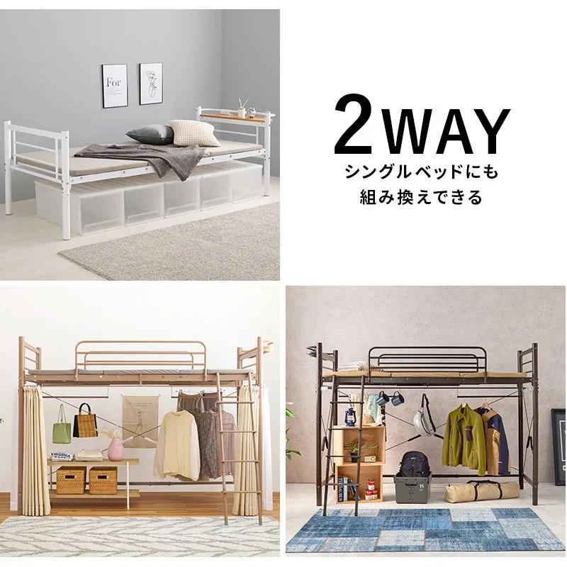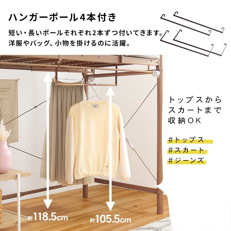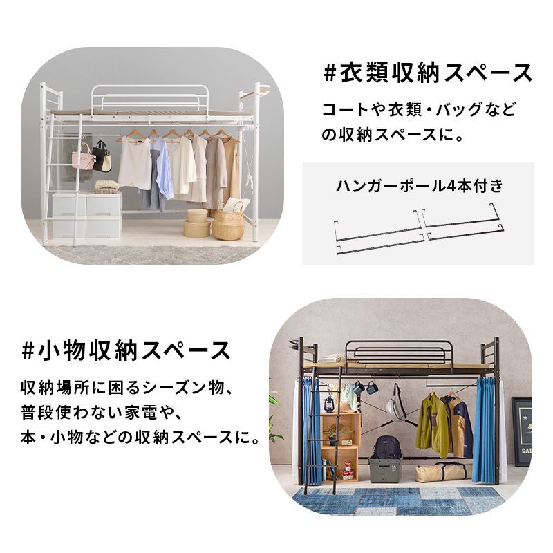 【商品説明】 ベッド下の空間に市販のカーテンを取り付け可能なパイプロフトベッド。ハンガーポールもついているので衣類収納としても活躍。季節家電や本、小物などの収納スペースが確保できるミドルタイプ