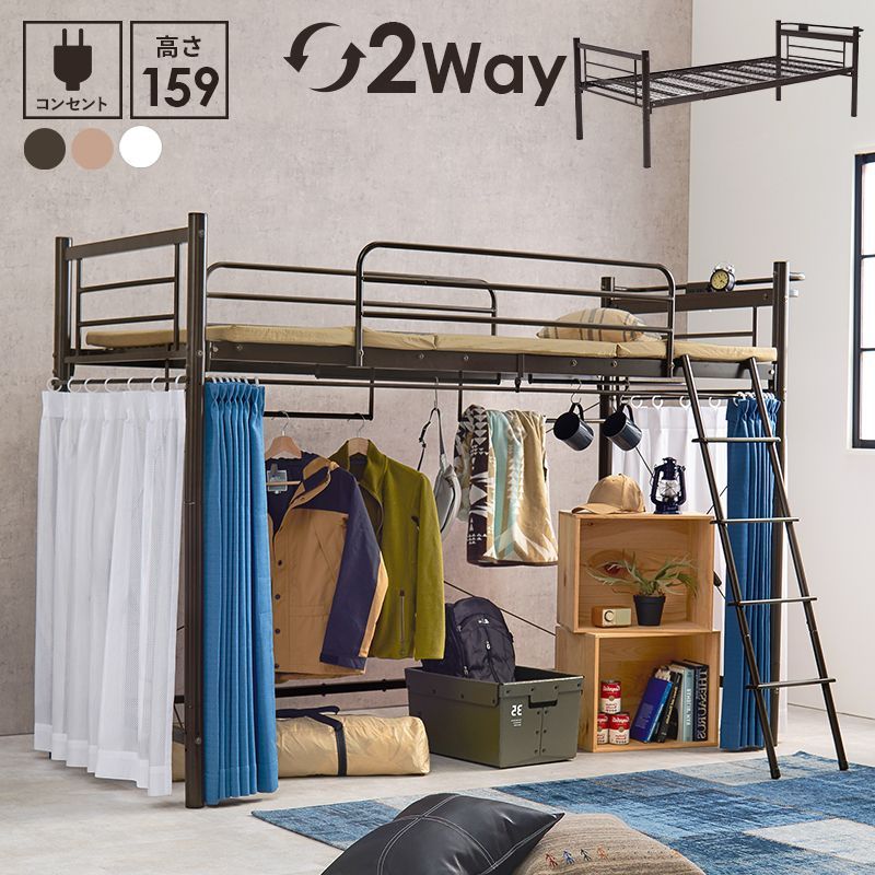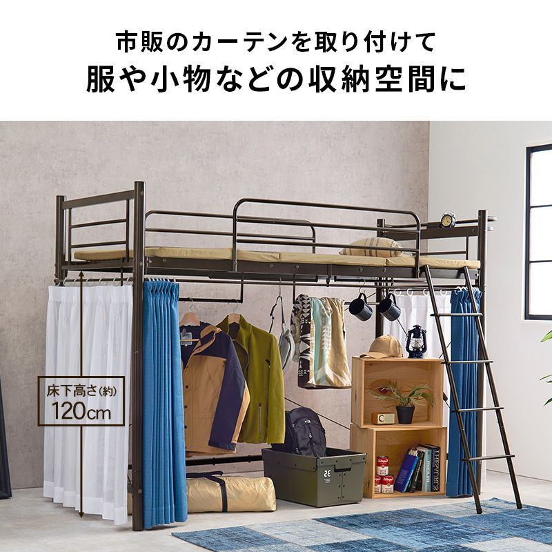 【商品説明】 ベッド下の空間に市販のカーテンを取り付け可能なパイプロフトベッド。ハンガーポールもついているので衣類収納としても活躍。季節家電や本、小物などの収納スペースが確保できるミドルタイプ