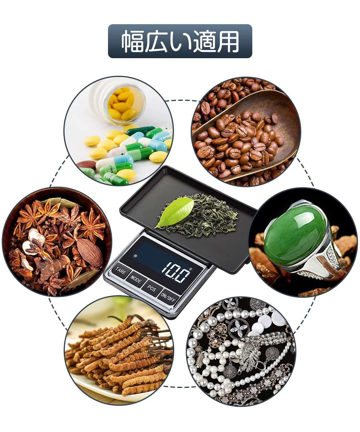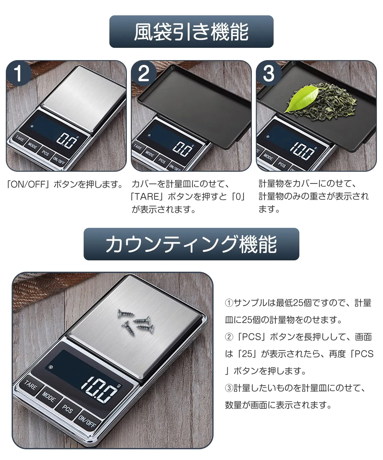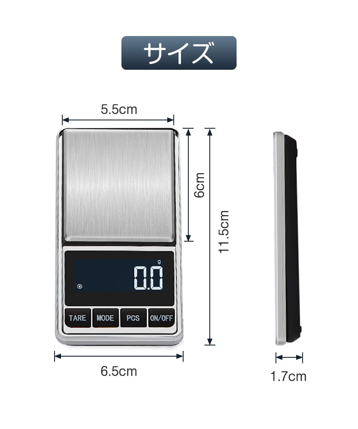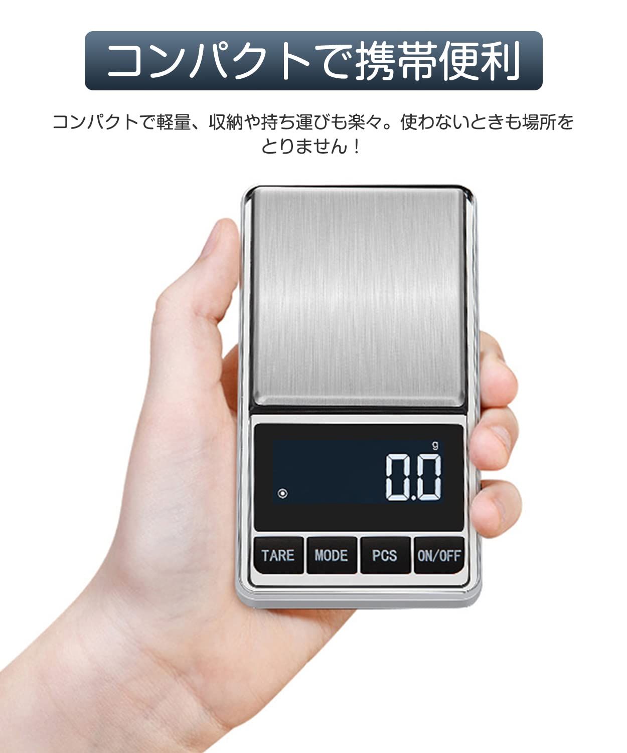 【多機能】LEDバックライト機能、風袋引き機能、カウンティング機能、自動校正、自動パワーオフ機能(60秒)、低電力提示(LO)、過重量提示(OLd)。