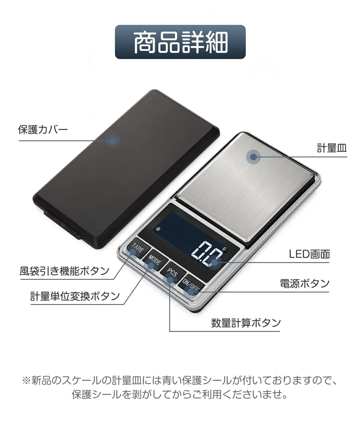 【使用電池】単4電池*2(付属) ※新品スケールの計量皿に青い保護シールが付いております。