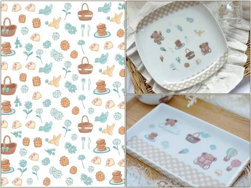 【白磁用転写紙】 ポーセリン・ポーセラーツ 白磁用 ピクニック転写紙 です。 パンケーキ、かごバッグ、小鳥、デイジー ワッフル、サンドウィッチ、カトラリーと 可愛いを沢山詰め込んだ転写紙と なっております♡ お子様だけでなく 大人もときめくようなデザイン♪ 大きさにも拘って作ったので ワークショップでも使いやすいですよ♡ ・白磁用転写紙 ・カバーコート:クリア ・サイズ:A4 ・推奨焼成温度:800℃程度 ※お持ちのお窯により調整して下さい。 ・商用利用可能 商用利用可能です。幅広くお使い下さい。