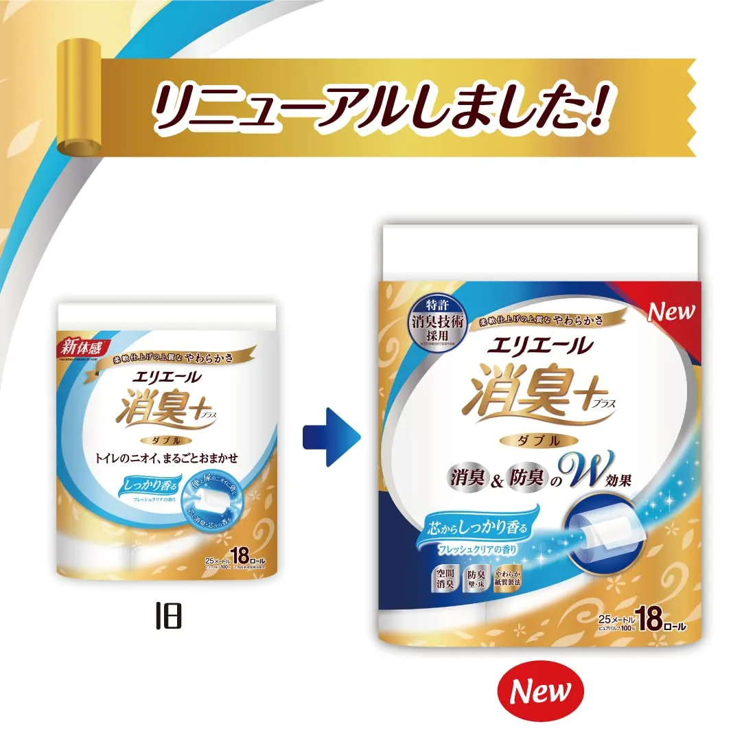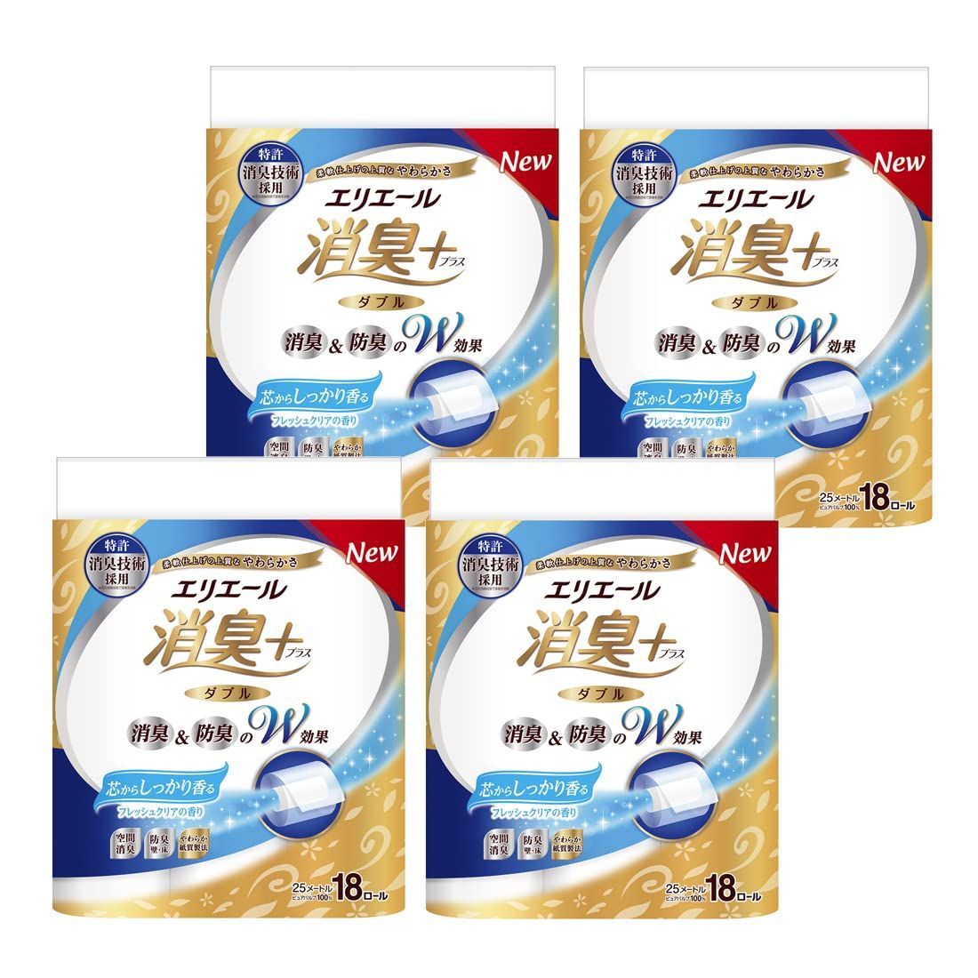 新品 エリエール トイレットペーパー 消臭プラス(+) 25m×72ロール (18ロール×4パック) ダブル パルプ100% 芯からしっかり香るフレッシュクリアの香り【ケース販売】