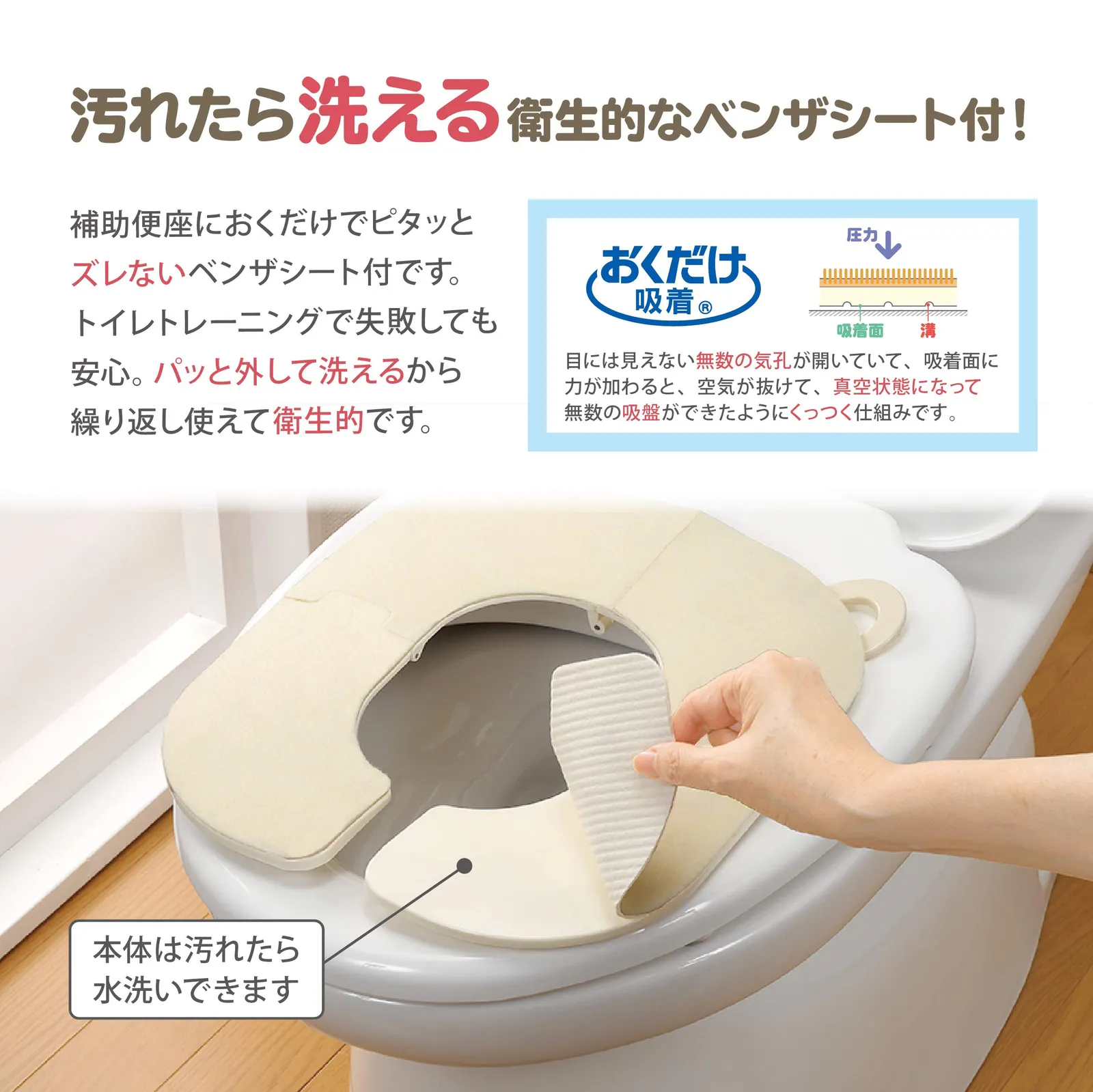 ・おくだけでズレない吸着ベンザシート付き。ベンザシートが汚れた場合は、洗濯機でお洗濯できます。