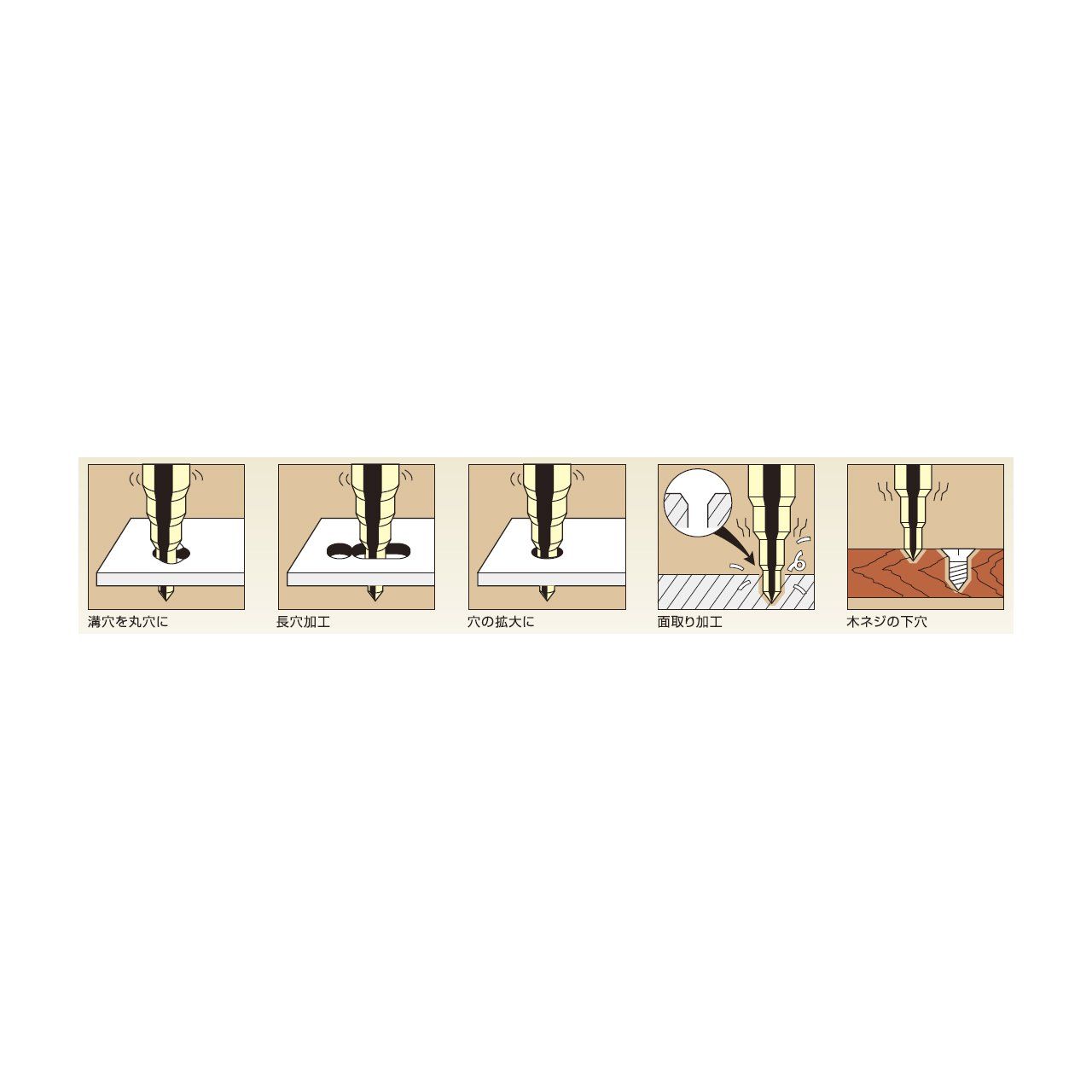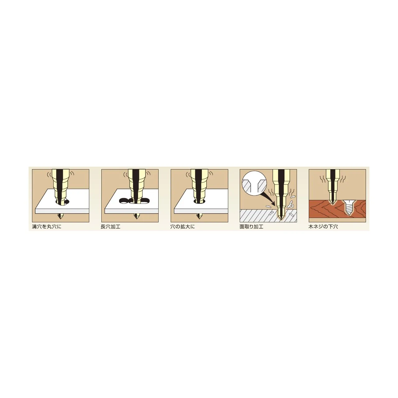 スチール鋼、銅、真鍮、ステンレス、アルミ、プラスチック、木材などの穴あけや、拡大、面取り加工に
