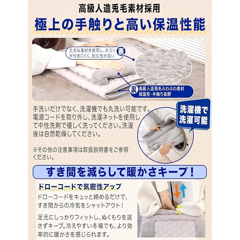 【丸洗い可能+2年】 コードを外して丸洗いOK(洗濯ネット推奨)。自動温度調節・過熱防止機能・PSE認証で安全性も確保。さらに安心のメーカー2年間延長付きで、長くご愛用いただけます。