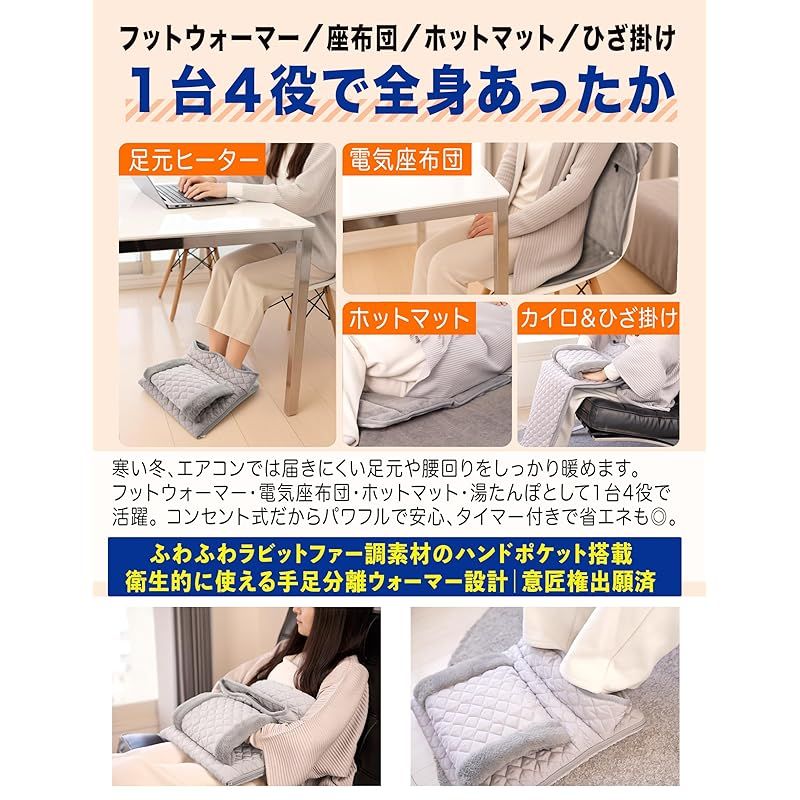 【高保温・汚れにくい耐久素材・人工兔毛・汚れ防止】 使用者の身になって設計し、一般的なホットマットや足元ヒーターよりも厚みを持たせた高保温素材を採用。表面は防塵・耐摩耗生地で、床置き使用でも汚れや擦れに強く、手入れも簡単。さらに手を入れる縁や裏側にはふわふわの人工兔毛を使い、電気カイロや足温器として心地よい触感を実現。コードを外せば洗濯機で丸洗いOK。