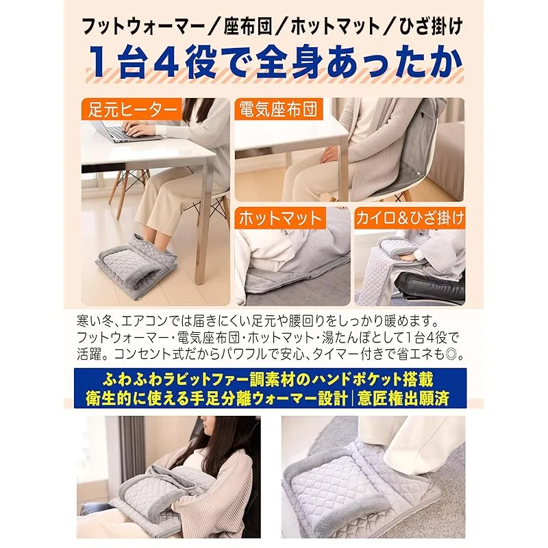 【意匠権申請済み・独自手足セパレートデザイン・高級ブランド鞄に使われるマトラッセ工法】 他社のフットウォーマーやホットマットとは一線を画す、意匠権申請済みのオリジナルデザイン。高級バッグに採用されるマトラッセ工法を取り入れ、見た目にも上質感を演出。さらに手用スペースと足用スペースを分離した構造で、足元ヒーター/電気かいろとしても衛生的に使用可能。