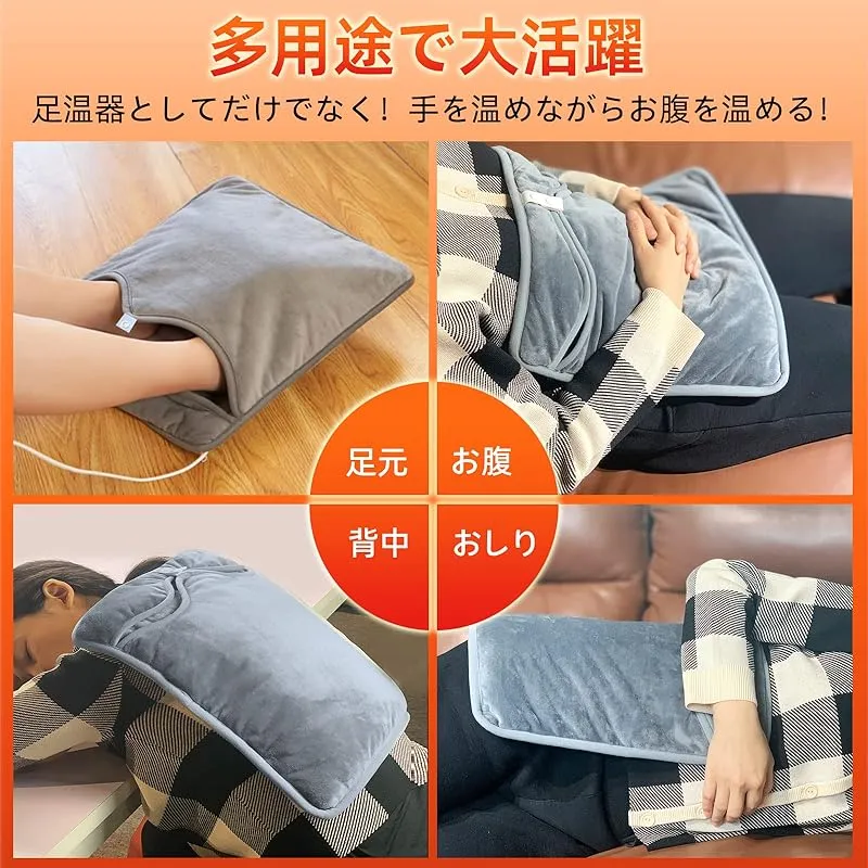 【お肌に優しい生地・優れた保温性・洗濯可能】この電気足温器は暖かくて、超柔らかな肌触りが魅力の「マイクロプラッシュ(Microplush)」を採用します。「マイクロプラッシュ(Microplush)」は、柔らかいビロードのような繊維が特徴です、 繊維の中に空気を含んで熱を逃さないので、フリースよりも保温性に優れています。手洗いだけでなく、洗濯機で丸洗いできます。洗える前に、ヒーターのプラグ部分を抜いて、カバー部分の洗濯可能です。(コントローラーをや電源コードの洗浄はできません。) ??