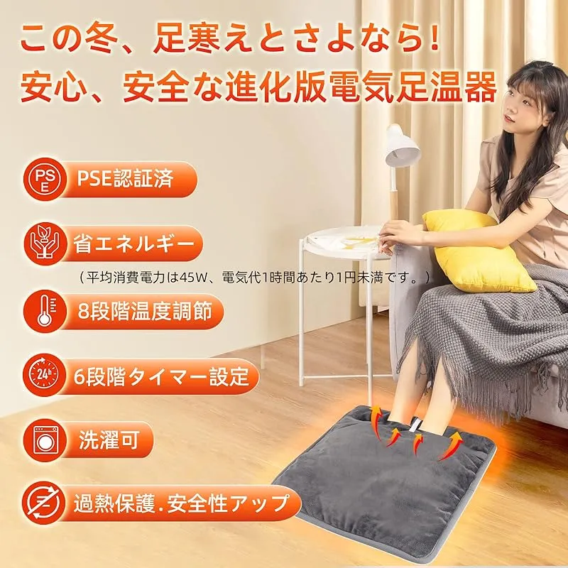 【 2025新登場!8段階温度調節・6段階タイマー設定】BILIWALの足温器をは過熱保護機能付きの新型炭素繊維発熱芯を採用しており、8段階の温度調節と6段階タイマー調節機能付き、20秒で素早く加熱、最高70℃まで加熱でき、電源を切り忘れても、設定されたタイマーになると自動的に電源が切れ、より安心に体験いただけます。この電気足温器はコンセント式フットウォーマーで、USB式に比べて時間が待たずにスバ早く加熱できるメリットがあり、加熱効果も大きいです。 ???