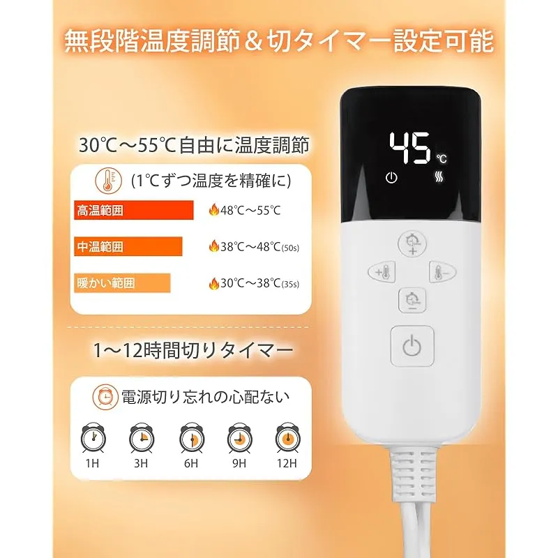 【温度調整&タイマー機能】30℃?70℃の範囲に、自由にお好きの温度を調節できます。場所や周囲温度により、電気足温器の最適な温度に調整できます。