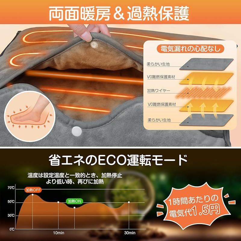 【両面加熱・安全性高い・PSE認証済み】INZYLA電気足温器はPSE認証取得済みです。足温器の両面にも加熱ワイヤーを内蔵しており、同類品より全面的に足を暖めます。五層の安全構造及び過熱保護機能や均一加熱などにより、安心して心地よい暖かさで冬で快適に過ごします。