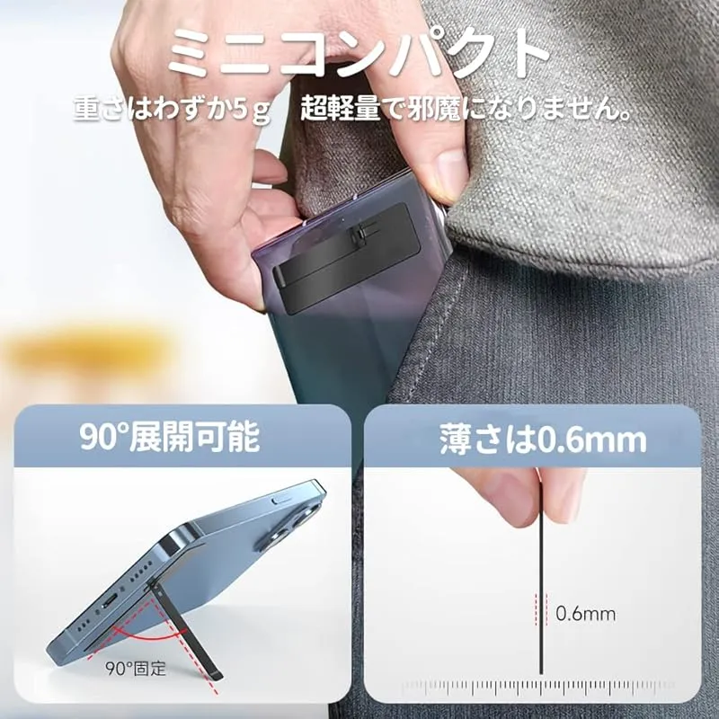 【スリム & 軽量】商品の重量: 5g、厚さ: 0.6mm、縦: 19mm、横: 60mm。かさばることなく、便利なスタンド機能をお楽しみいただけます。