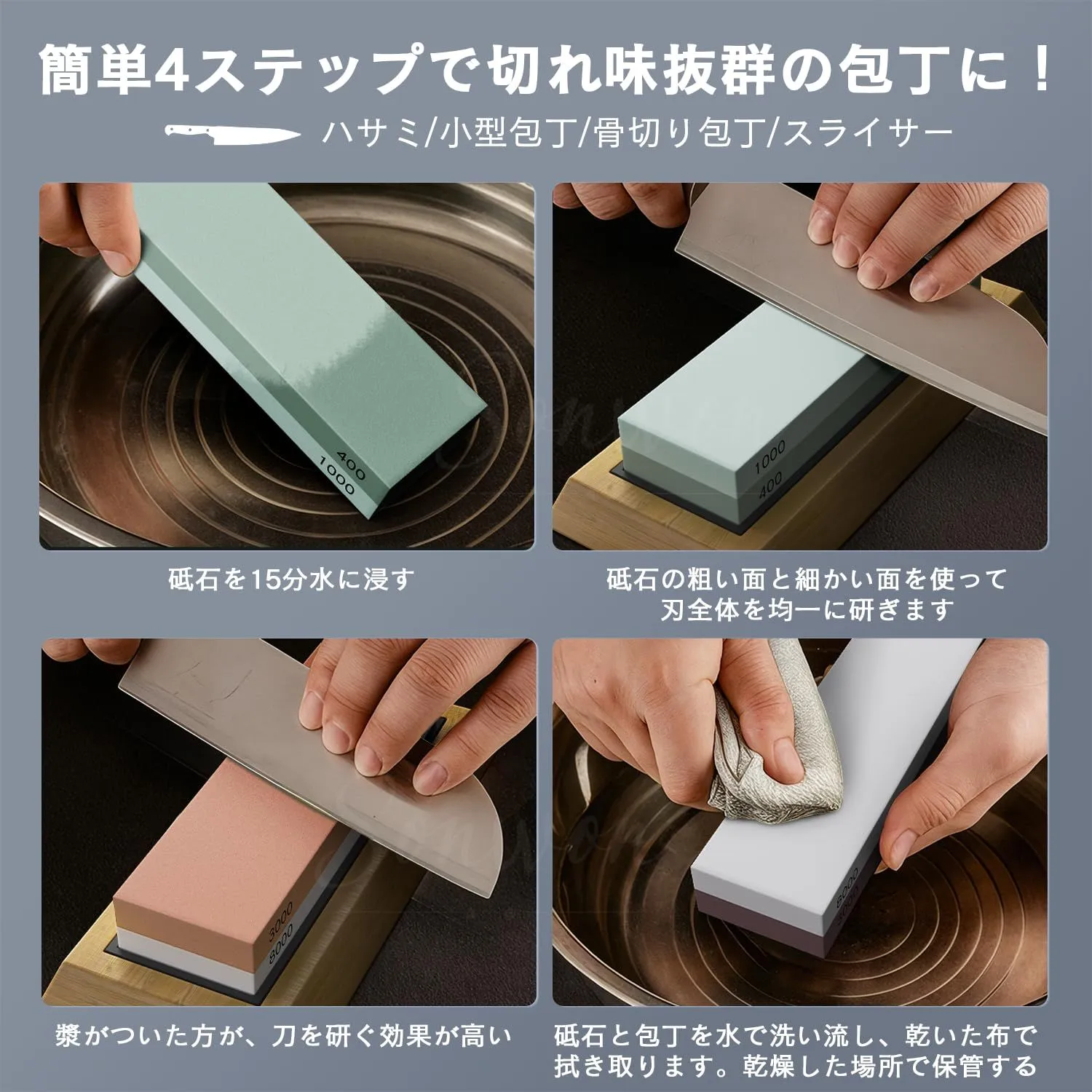 【荒砥石中砥石一括】400と1000の荒砥石は、切れ味の悪い包丁や損傷した刃を一番鋭く研げる。3000と8000の仕上砥石は、より良い切れ味を追求したい時に役たちます、包丁をピカピカするには楽々