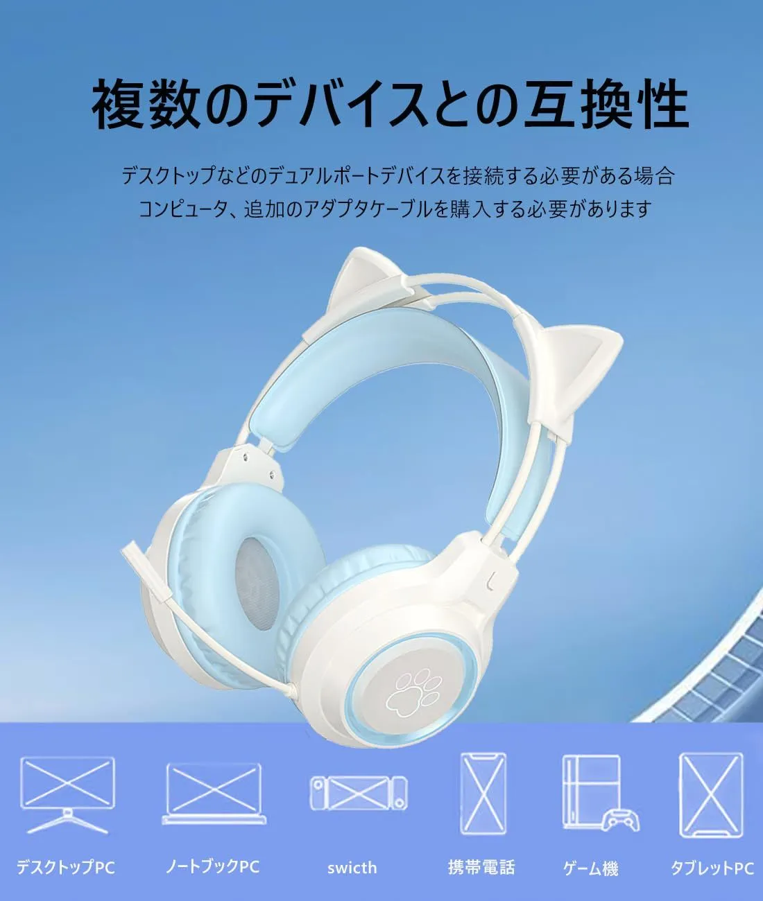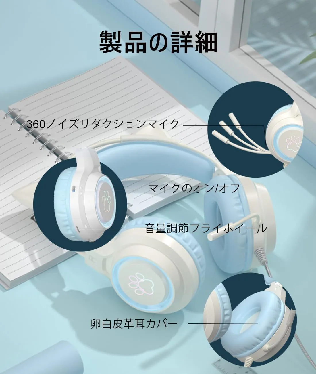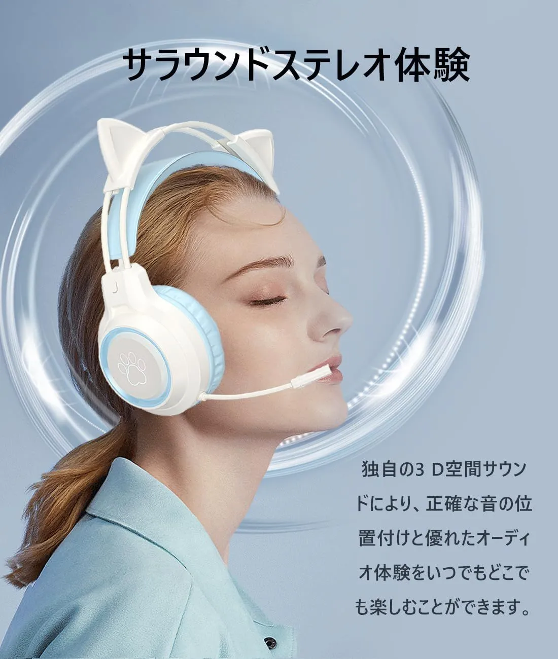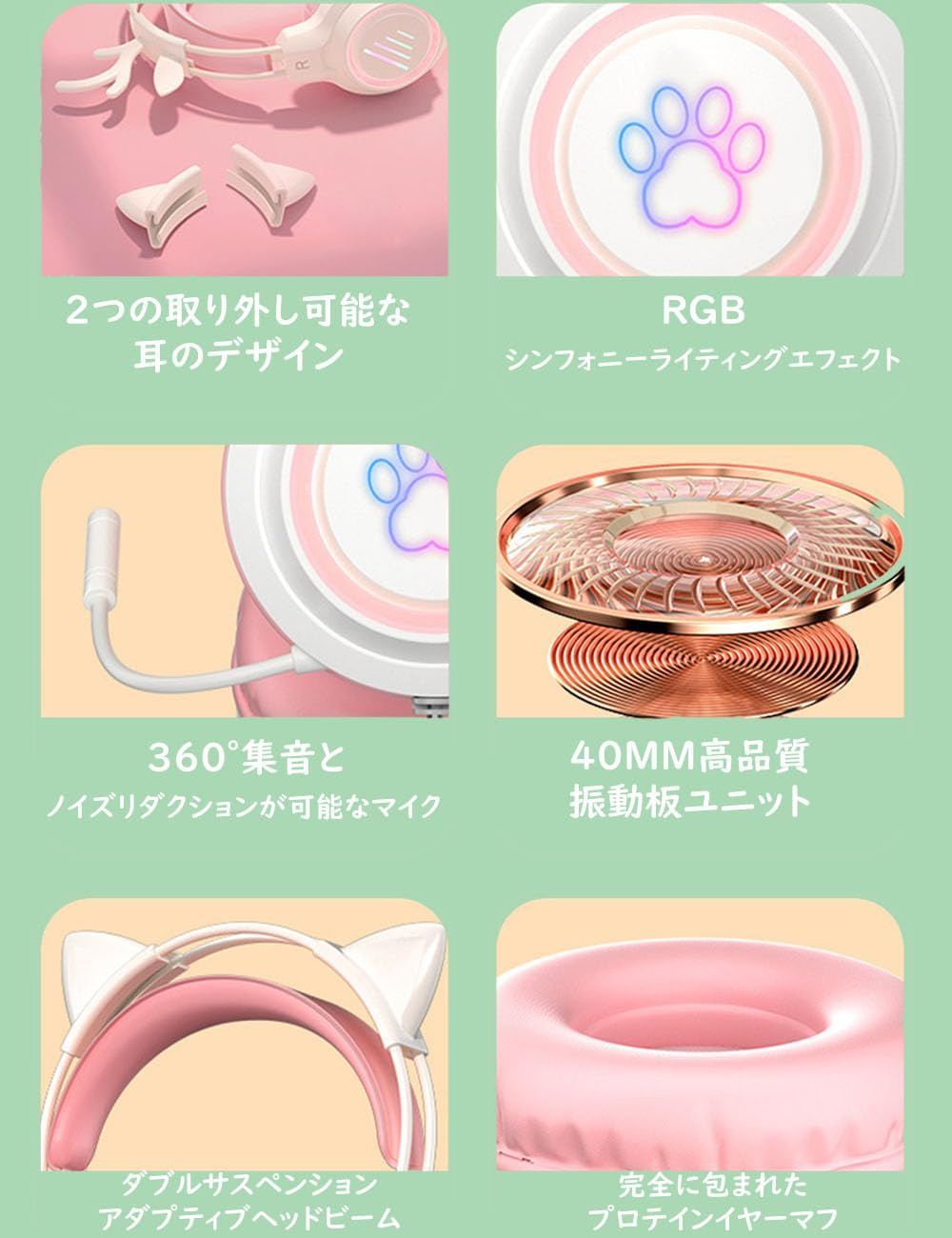 【人気のデザイン】猫耳デザインは可愛くて、ゲームをする時自分がゲームの主役だと感じられて、ゲームの雰囲気がすぐ盛り上げます。また、ヘッドホンの猫耳が取り外すこともできて、とても優しいデザインです。それ以外にも、ヘッドホンの本体の上にかわいい猫の足のRGBライドが付いています。女性ペレイヤーだけでもなく、子どもの中にも大人気です。