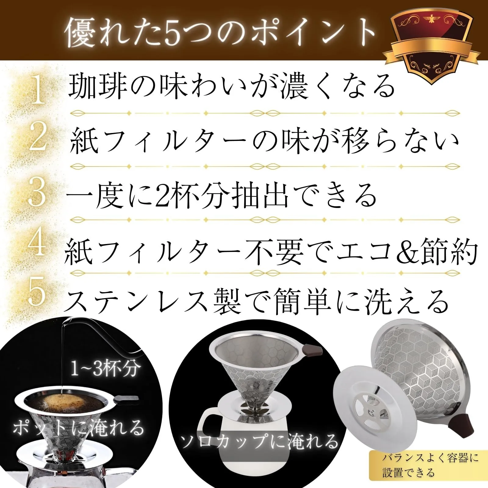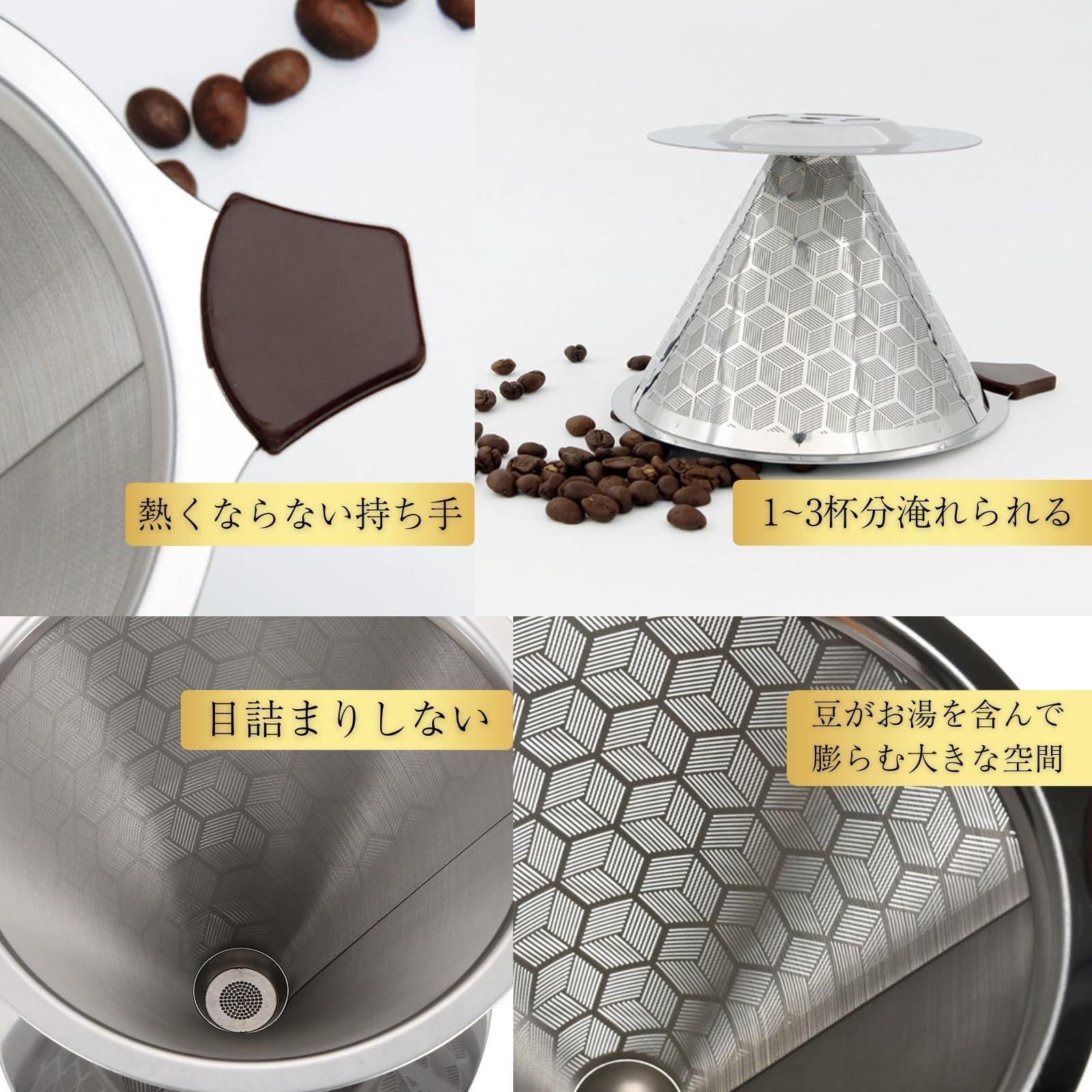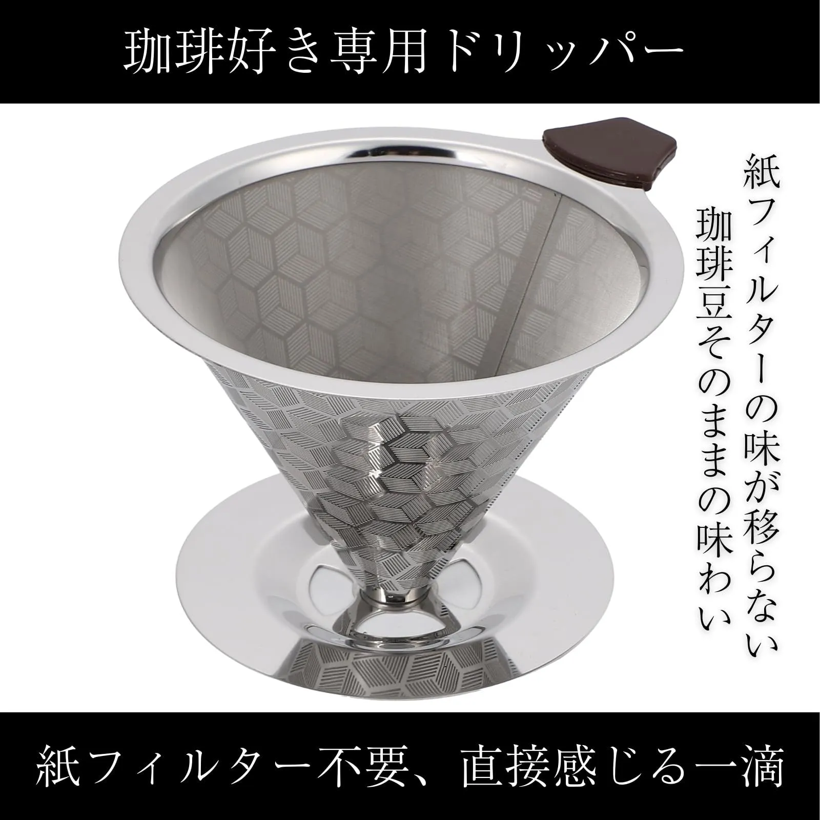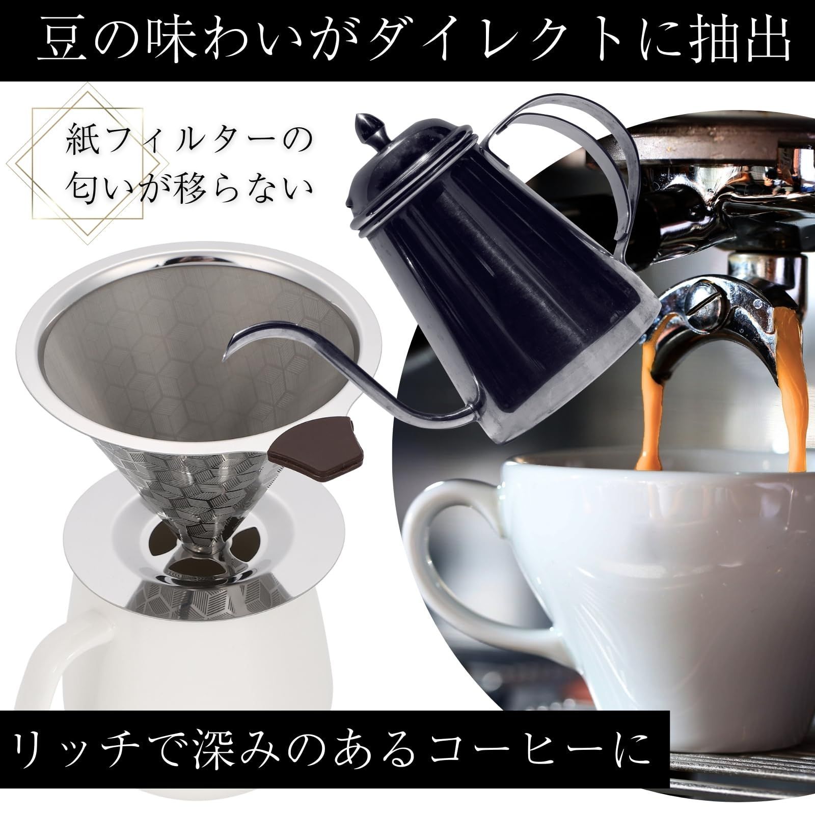 ・このステンレス製コーヒードリッパーは、紙のフィルターを使わないため、コーヒー本来の味と香りをストレートに感じることができます。繊細な味のニュアンスまでしっかりと引き出し、よりリッチで深みのあるコーヒー体験を提供します。
