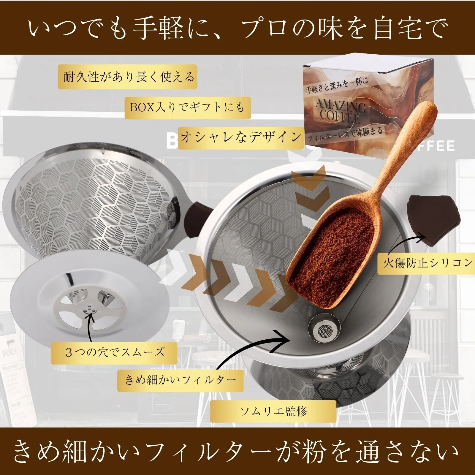 ・いつでも手軽に、プロの味を自宅で。忙しい朝もこのドリッパーなら一杯のコーヒーがあっという間に。紙フィルター不要で経済的かつエコフレンドリー、毎日のコーヒーブレイクをもっと手軽に、もっと美味しく。ステンレス製で耐久性も抜群、長く愛用いただけるアイテムです。