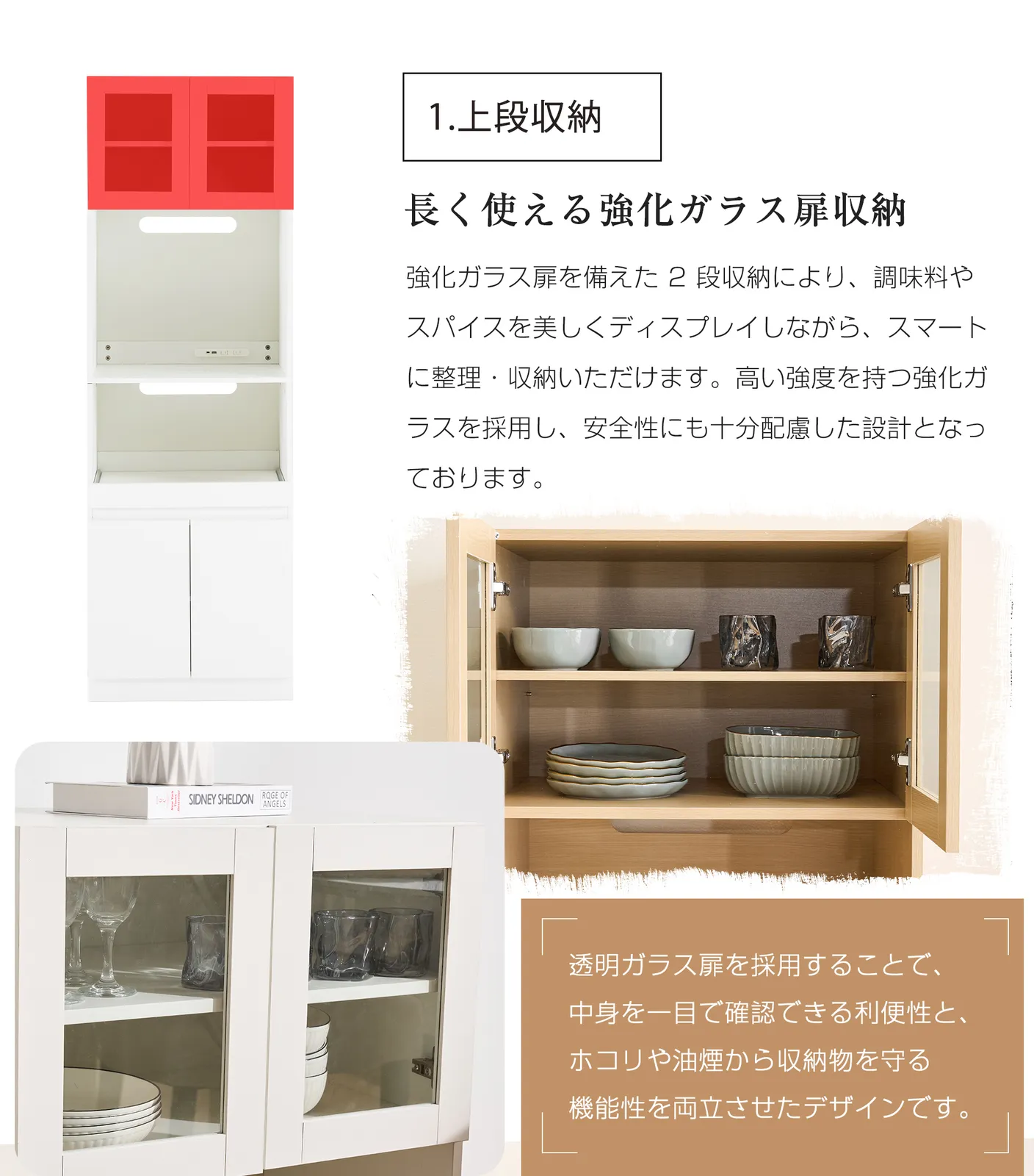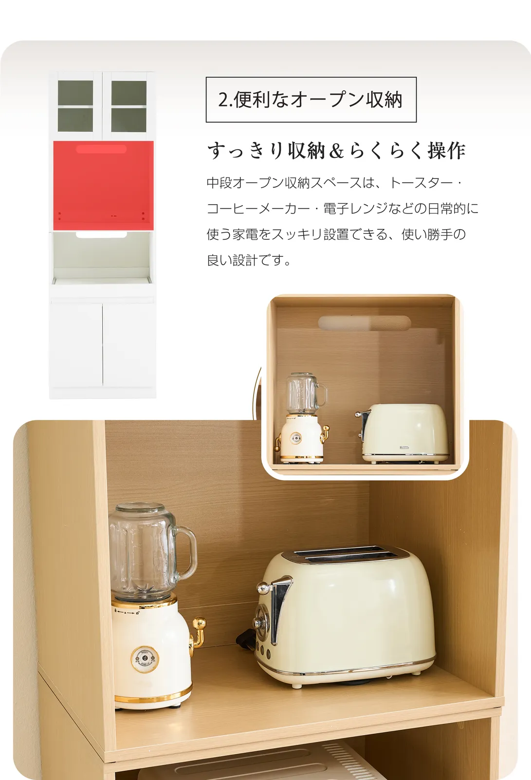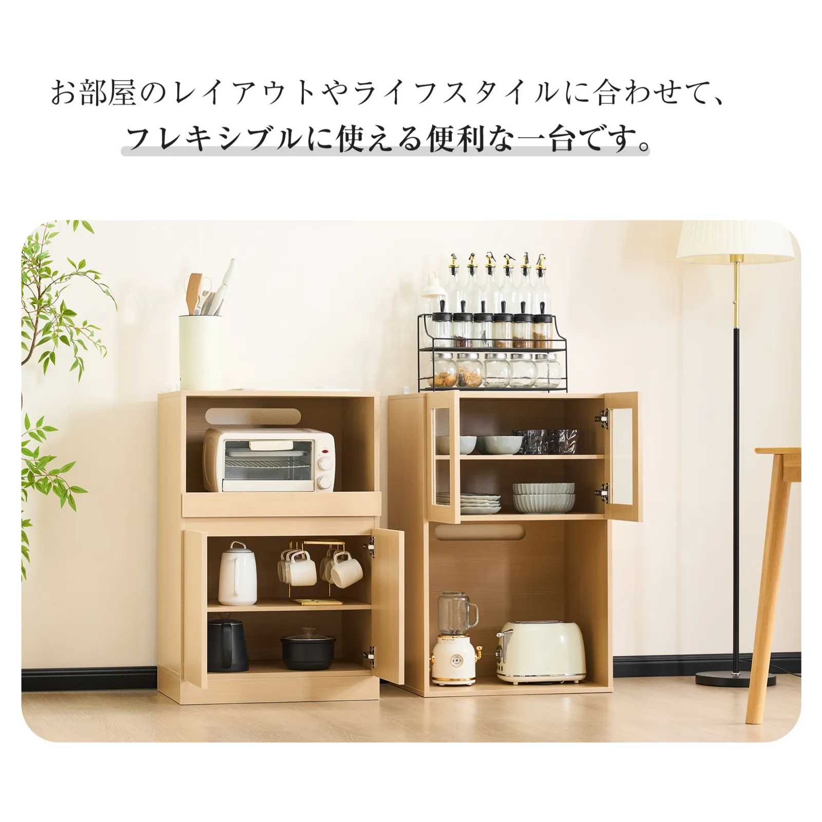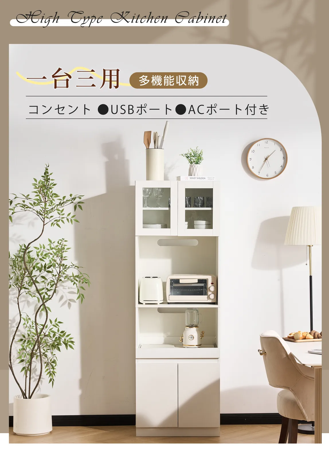 食器棚 キッチンボード レンジボード レンジ台 キッチン収納 家電収納 キャビネット オープン棚 強化ガラス扉 木目調 スリム 幅59cm 可動棚 スライド棚 2口コンセント USBポート ACポート 通気孔 一人暮らし 省スペース 調理家