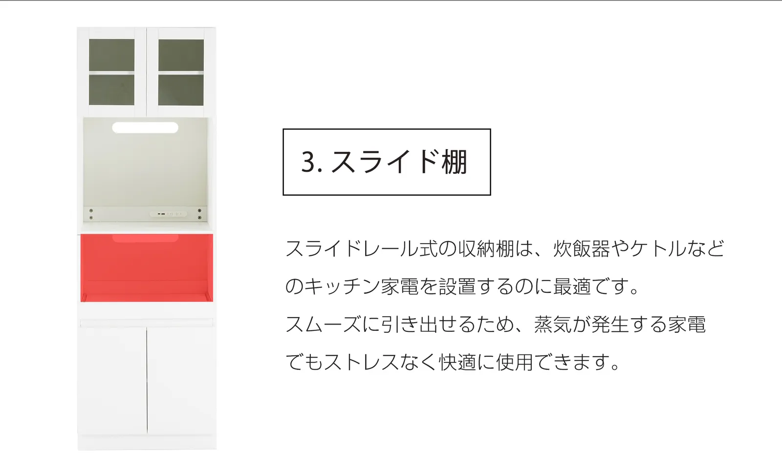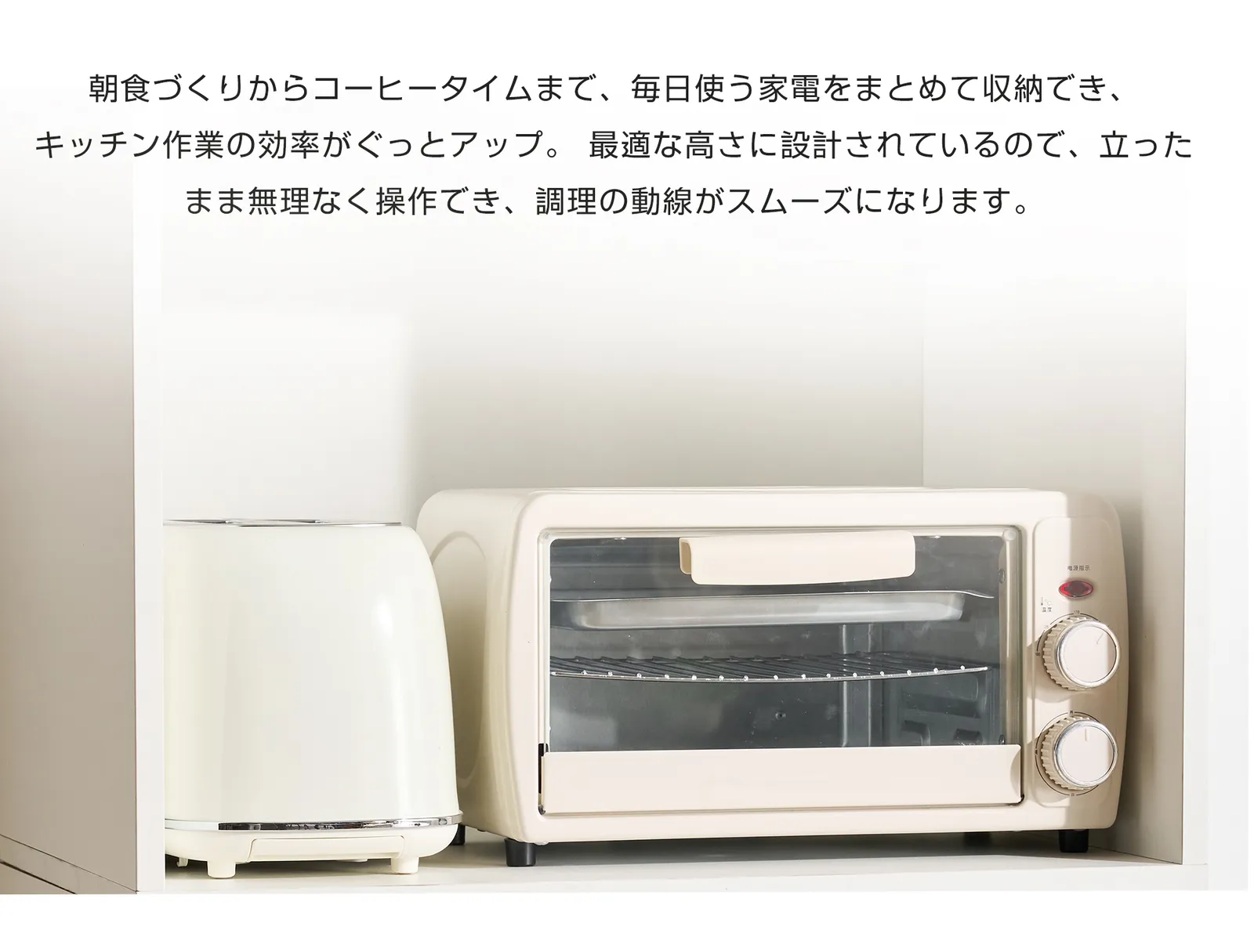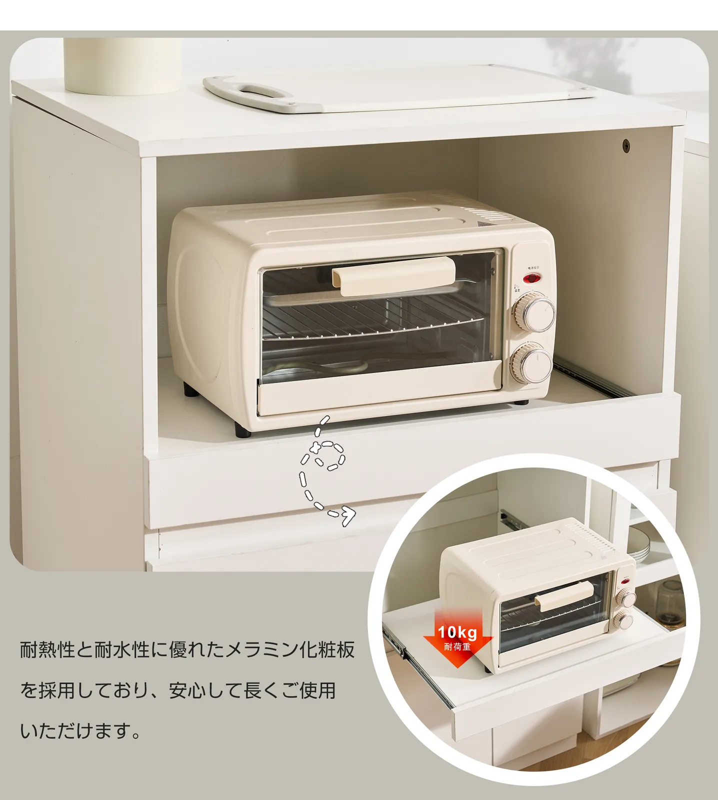【使いやすい家電収納】 スライドレール式の棚を備え、炊飯器やケトルの設置に便利。必要な時だけ手前に引き出せるので、蒸気が出る家電も快適に使えます。
