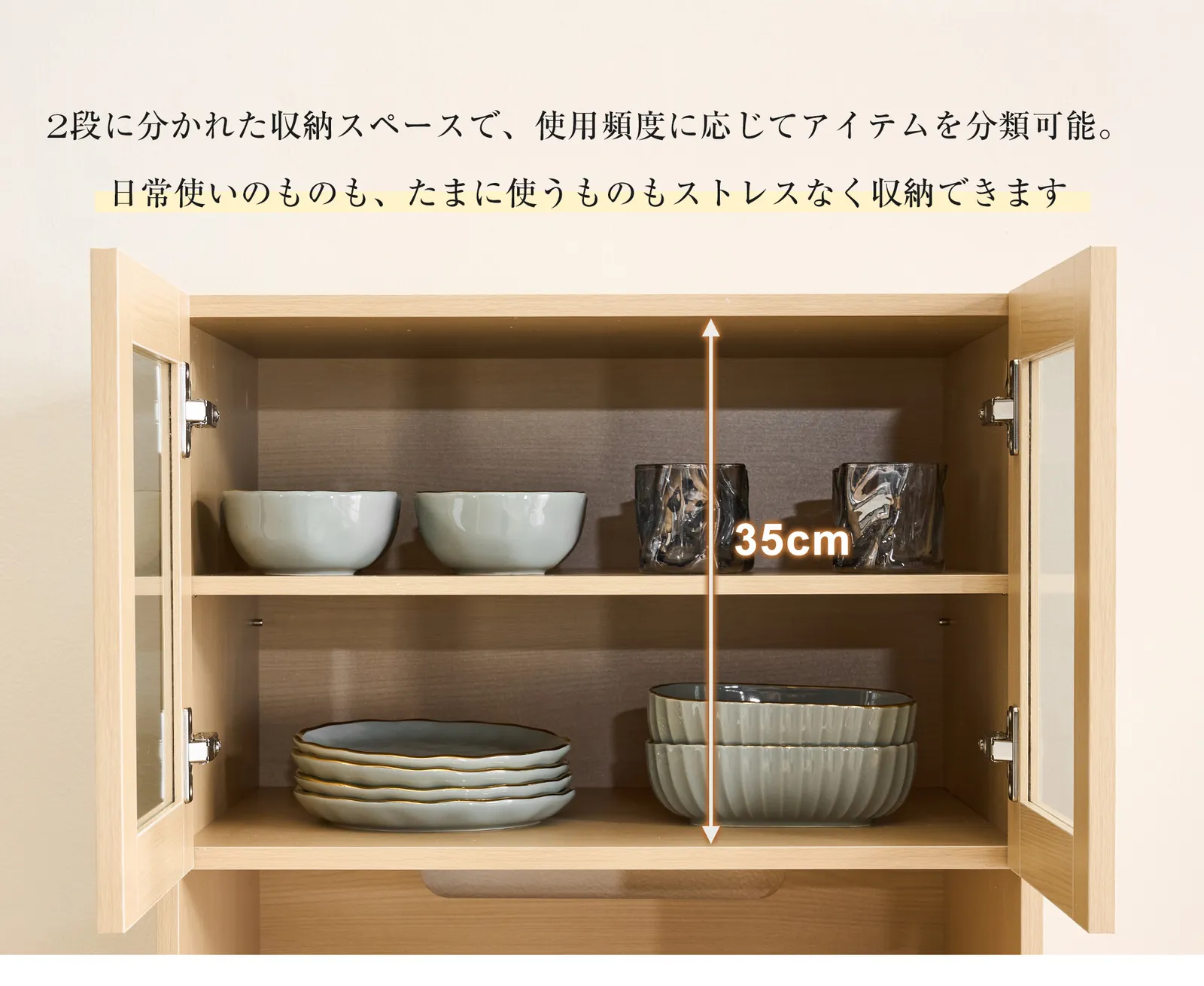 【ガラス扉付き収納】 強化ガラス扉の収納スペースを採用。調味料や小物を見やすく整理でき、見せる収納としても楽しめます。強度にも配慮した安心設計です。