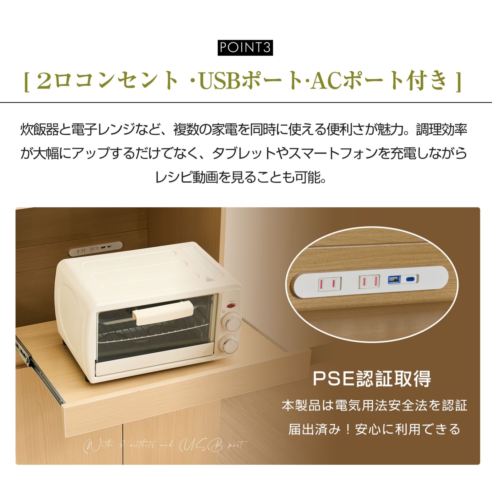 【コンセント・USB・ACポート付き】 2口コンセントに加え、USB・ACポートを搭載。電子レンジや炊飯器などを使いながら、スマートフォンやタブレットの充電にも便利です。
