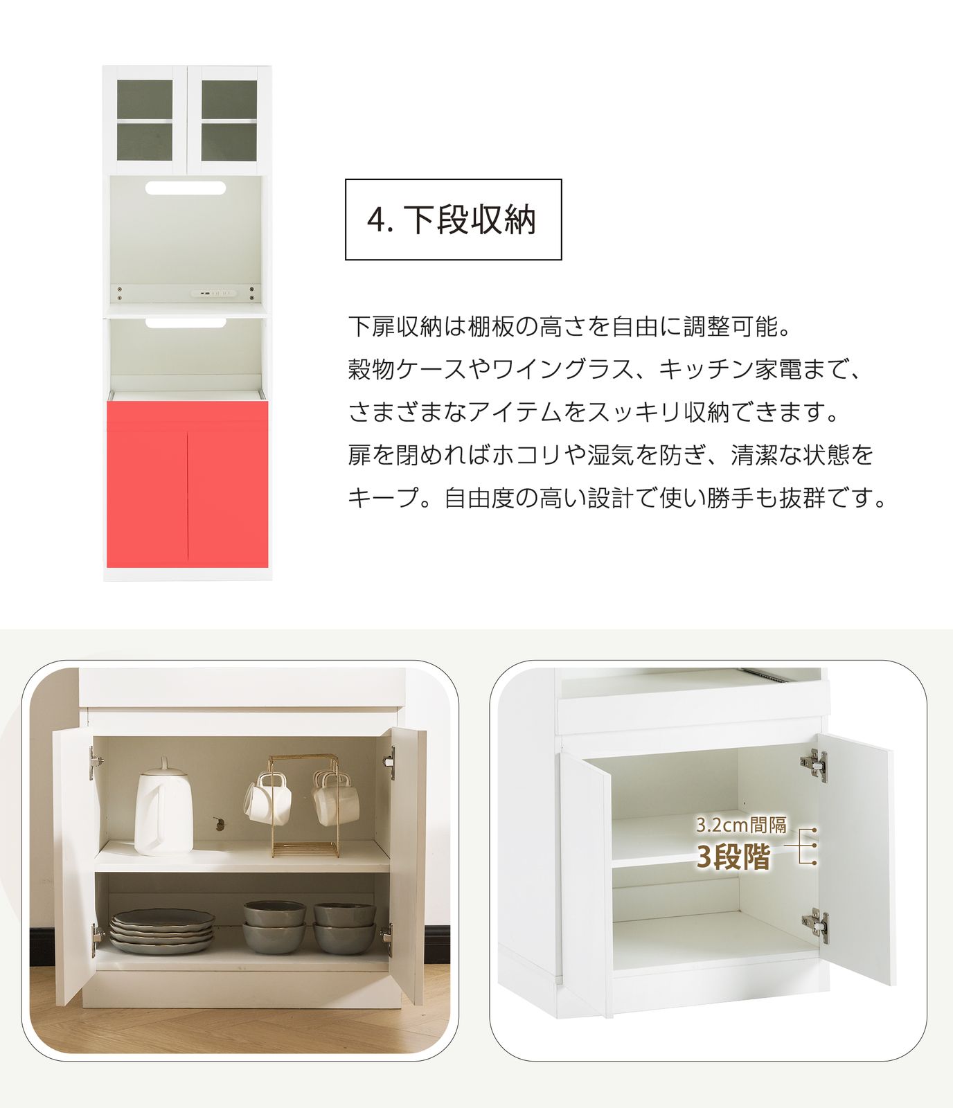 【可動棚で自在に調整】 収納物の高さに合わせて棚板の位置を調整可能。棚板を外して使うこともできるため、大きめの調理家電や背の高いアイテムにも対応します。