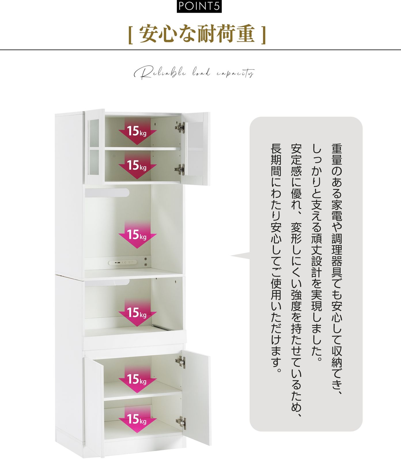 【丈夫で安心の設計】 重量のある家電や食器類も安心して置ける頑丈設計。さらに背面には通気孔を備え、熱や湿気がこもりにくく、清潔で使いやすい環境を保ちます。
