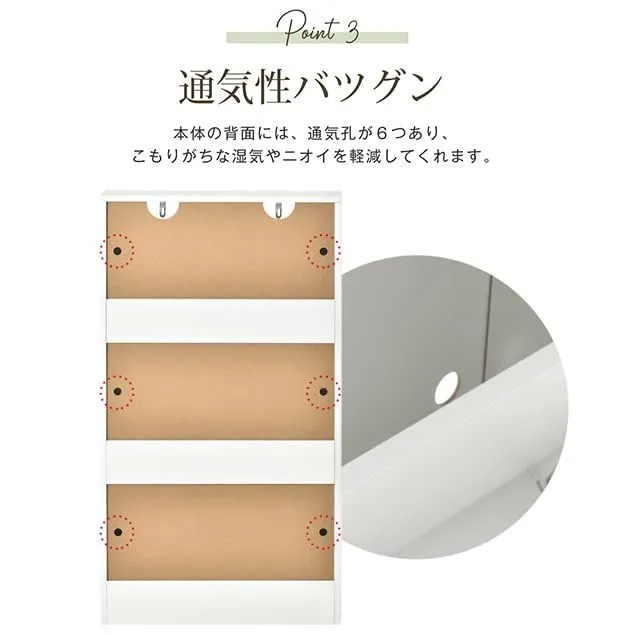【優れた通気性】背面通気孔で湿気とニオイを軽減本体の背面には、通気穴が6つあり、こもりがちな湿気やニオイを軽減してくれます。 商品サイズ:幅60×奥行17×高さ108cm 重量:16kg 天板静止耐荷重:約25KG 素材: 天板: メラミン化粧板(厚み10MM) フレーム:メラミン化粧板(厚み10MM) カラー:ナチュラル/ダークブラウン/ ホワイト 組立品/完成品:組立品 最後までご確認頂き誠にありがとうございました。 上記をご確認頂き、ご購入いただけましたら幸いです。 何かご不明な点がございましたらお気軽にメッセージからお問い合わせ下さい。