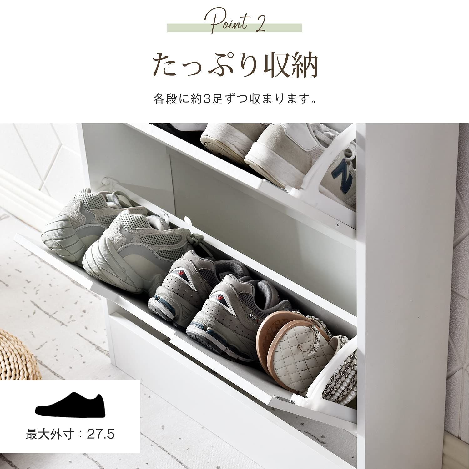 【省スペース設計】軽いのに安定してくれます。しっかりと収納できるシューズラック、収納場所にも困りません。シンプルで無駄のないデザインで、玄関に置いても圧迫感がありません。場所を取らない省スペース設計で、靴箱からあふれた靴もスッキリ収納することができる便利な逸品です!