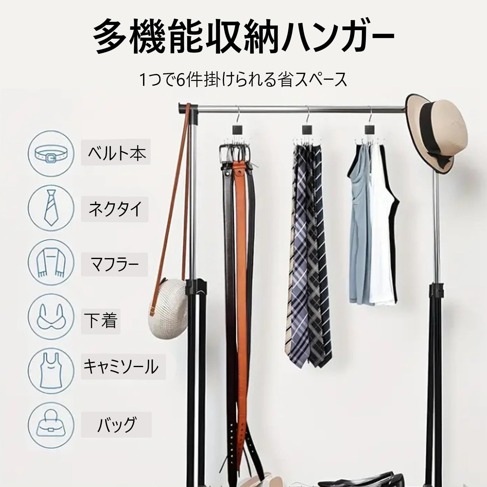【省スペース設計で狭い空間も効率活用】折りたたみ式の 6 フック設計で、クローゼットや押し入れの限られたスペースを有効に使えます。1 つのハンガーで最大 24 本のベルト・ネクタイを整理可能で、貴重な戸棚スペースを占有せず、収納効率を大幅アップ!