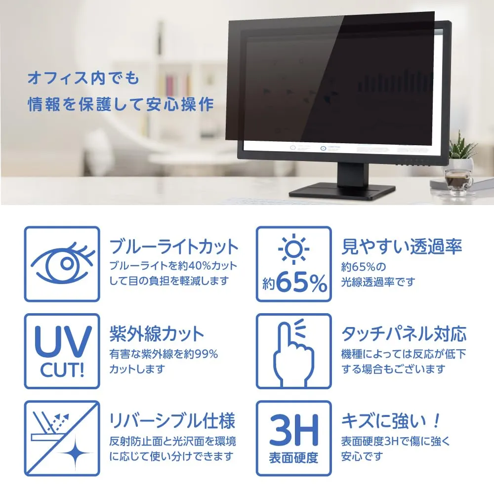 ●付属品:タブシール、モニター貼り付け用両面テープ2種、クリーニングクロス 60°の視野角で左右からの視線を防ぐ。フィルタ内のルーバーが画面の発光方向を正面にコントロール。ブラインド効果で正面からはハッキリ、横から見ると画面は真っ黒に見え、のぞき見を防止します。 リバーシブル仕様で反射防止面と光沢面を環境に応じて使い分けできます。 モニター貼りと差し込み式、2通りの取付方法。 タッチパネル対応 表面硬度3H 最後までご確認頂き誠にありがとうございました。 上記をご確認頂き、ご購入いただけましたら幸いです。 何かご不明な点がございましたらお気軽にメッセージからお問い合わせ下さい。