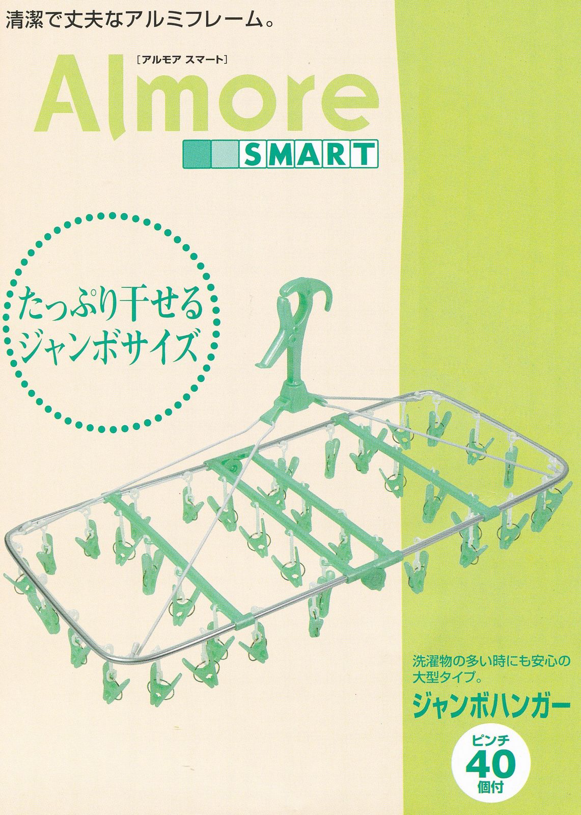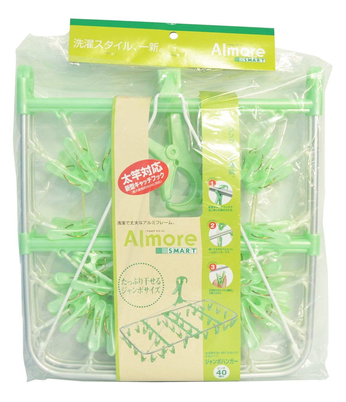 新品 オーエ 洗濯 物干し ハンガー グリーン 約横70×縦35cm ピンチ 40個 付き アルモアスマート ジャンボ 太竿対応 たっぷり干せる 軽い 丈夫な アルミフレーム 角ハンガー 洗濯バサミ 取り外し 可能 84673